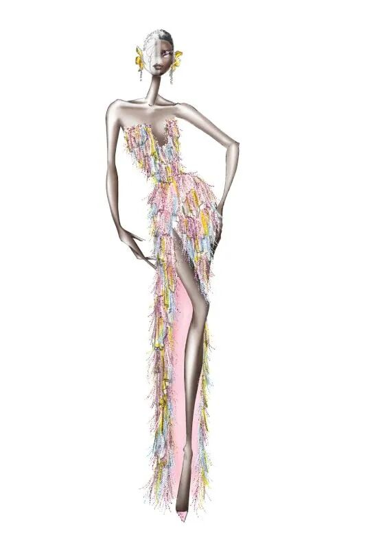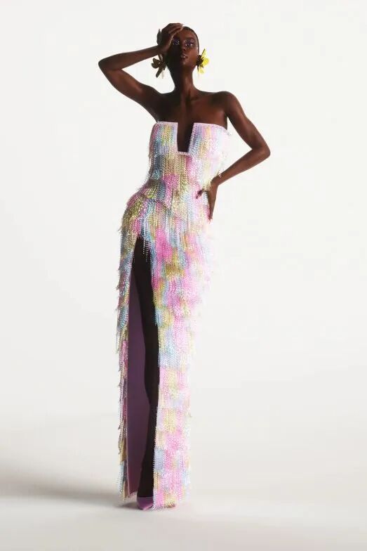 设计师Tamara Ralph通过水晶亮钻、花卉纹样、皮草流苏元素和波浪式的剪裁等精致细节营造出飘飘然的仙美视觉,表达了对浪漫与色彩的梦幻想象力。