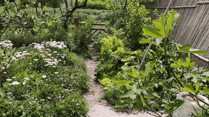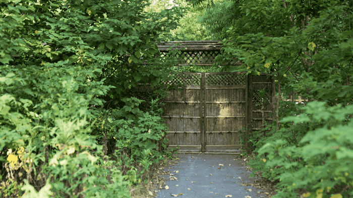 沿着一条小径,可以依次走过小溪、灌木丛、树林。杂草丛生的小径并不好走,蝉声蛙鸣非常吵闹,人沟通时需要大声说话。这个时节,园子没有什么姹紫嫣红的景象,而是一片浓绿。