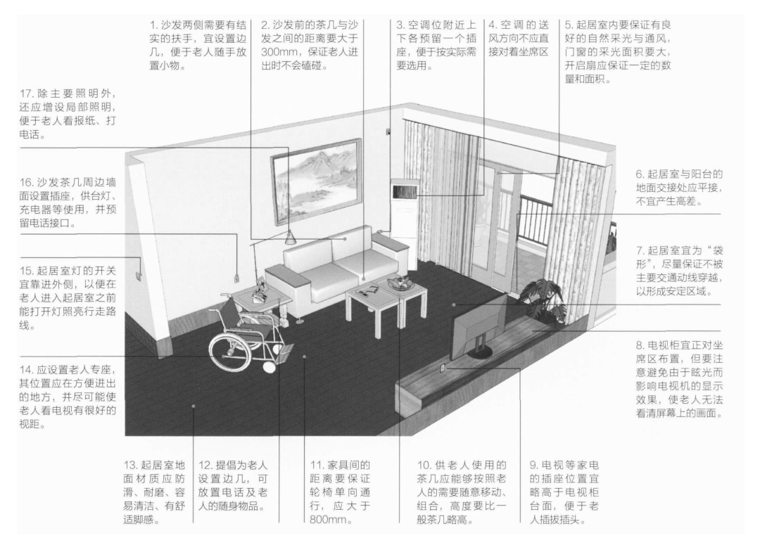 3. 起居室家具摆放应当方便老人进出,尽量避免采用大型组合沙发,避免将空间围合得过于封闭;