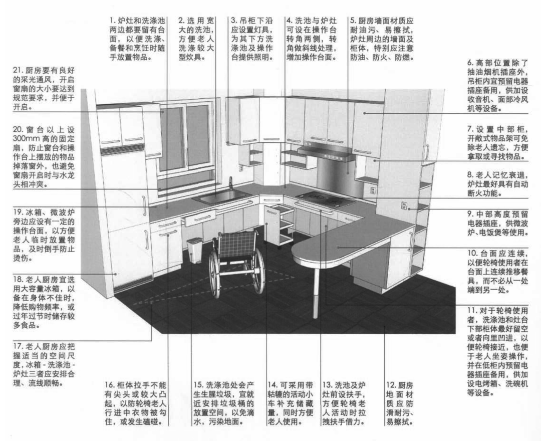 1. 为防止滑倒,老年住宅卫生间应特别注意将淋浴湿区与坐便器、洗手盆等干区分开,降低干区地面被打湿的可能;