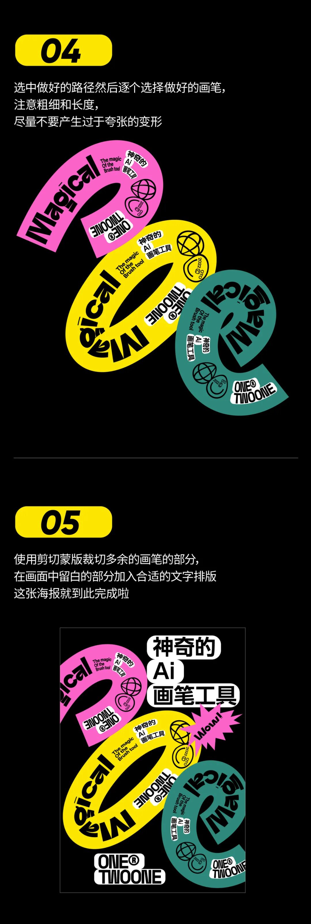 画笔工具这么用虽然看上去有点奇怪,将做好的文本和字块变成画笔,优点是可以快捷的将复杂的字体色块图形变成一个想要的“路径”,缺点是一定程度上会使排版和图形变形。