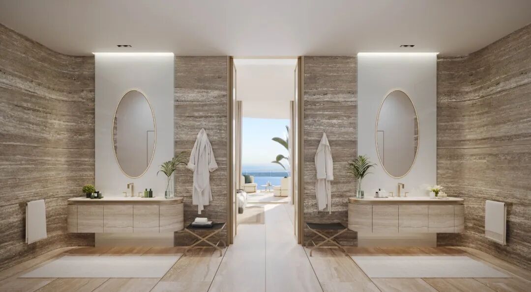 卫生间打造成左右对称的布局,有深色和浅色两种饰面可供选择。