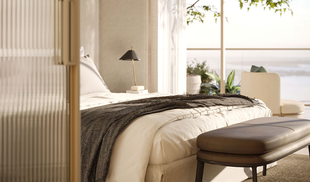 卧室的设计较为温馨,舒适的地毯和软包床头,营造出温馨宁静的休息环境,透过落地窗能看到室外不同时间的风景。
