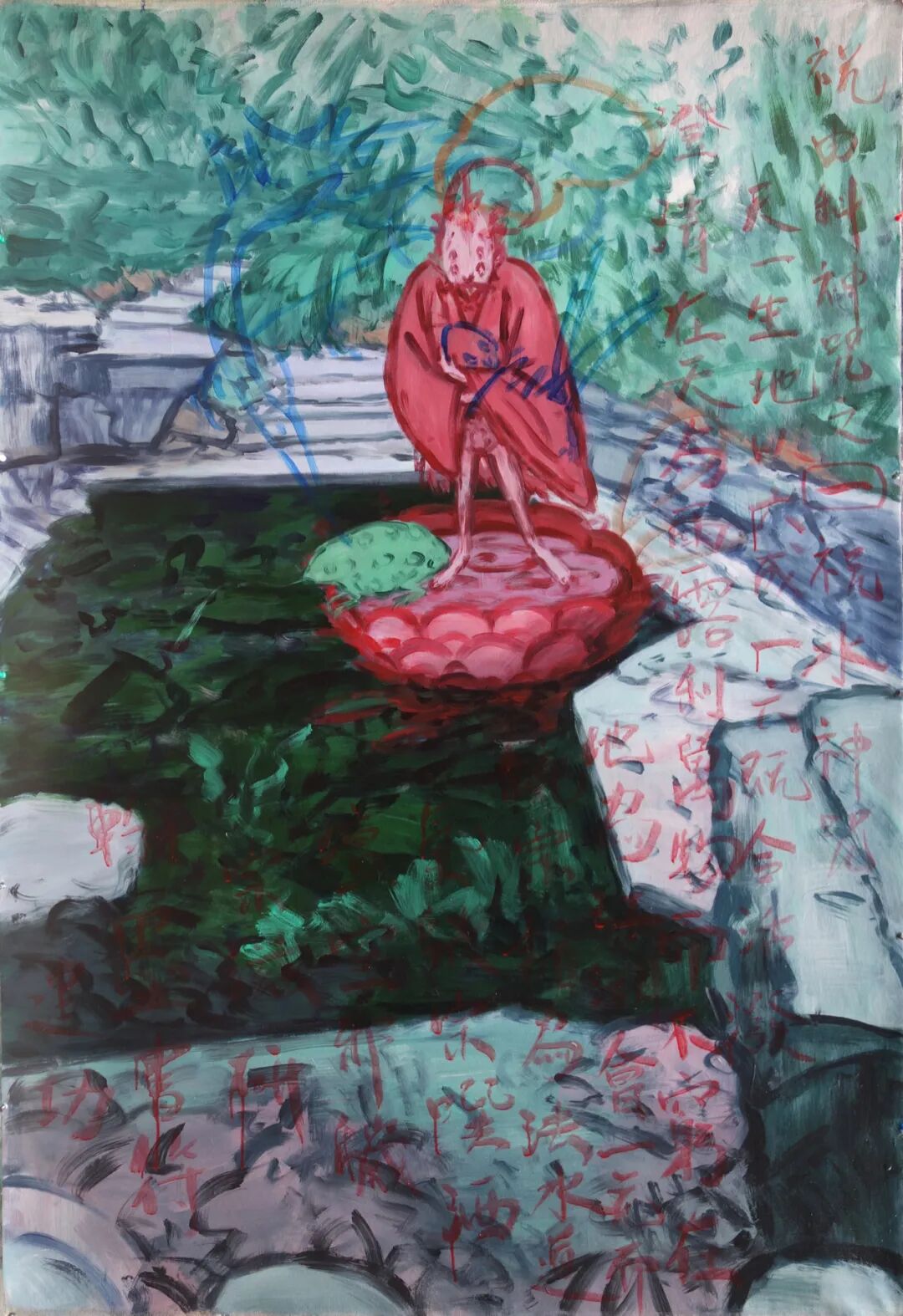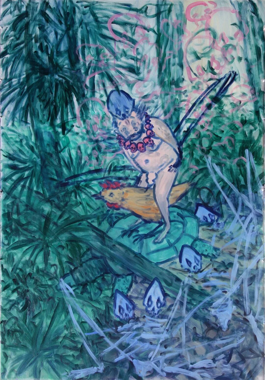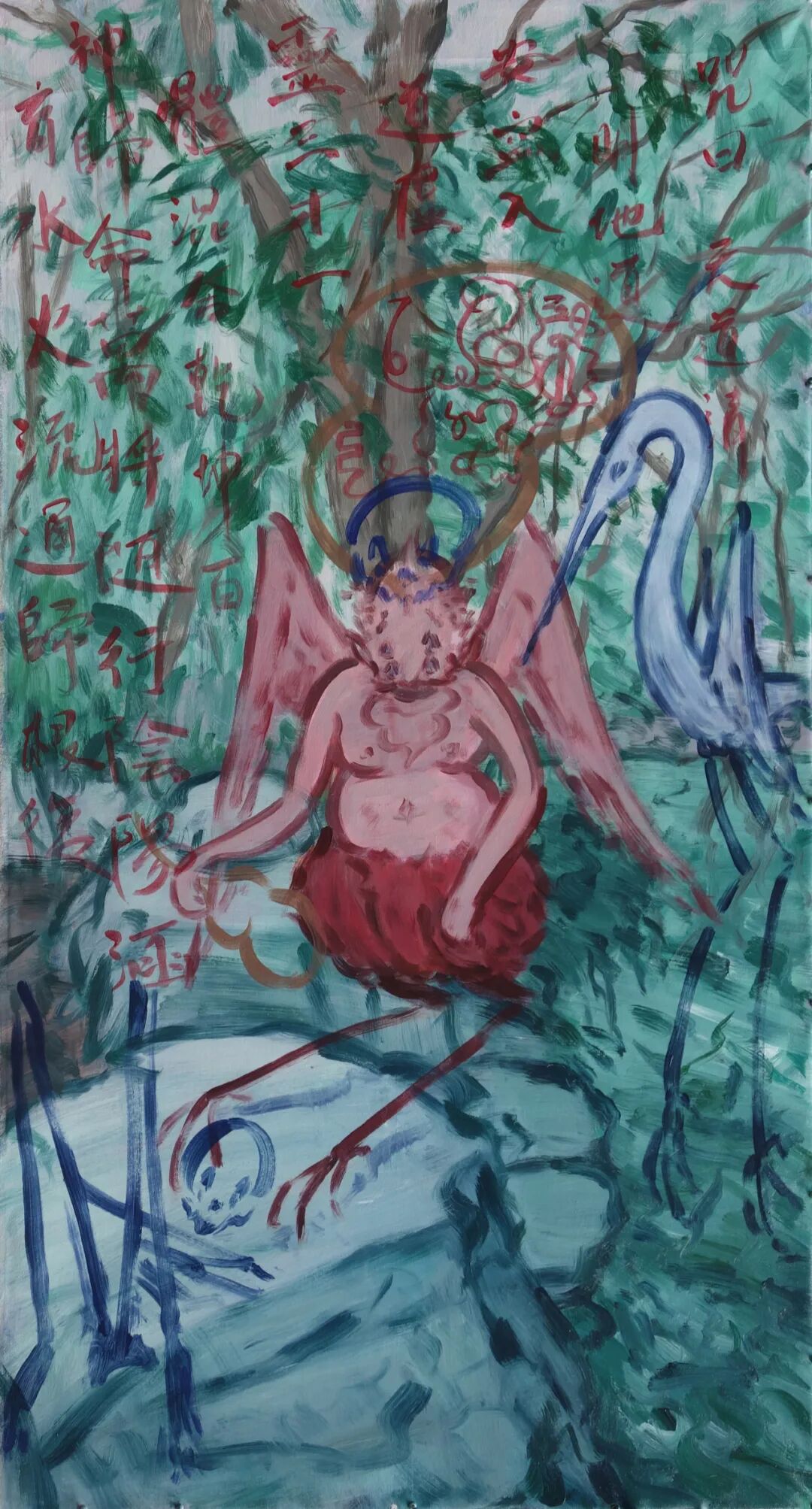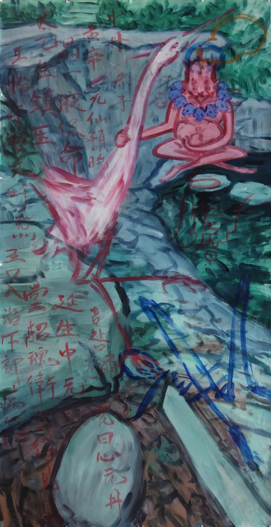 近期他的画,依然是“用不完的绿色”,不一样的是加入了对道家“不甚严谨”的学习笔记,唵风、仓宫、骷髅、少年、鸡、王八、仙鹤反复出现在画面里,还有几缕勃起的蓝色线,生硬地放置在画面前景消解着具象叙事。