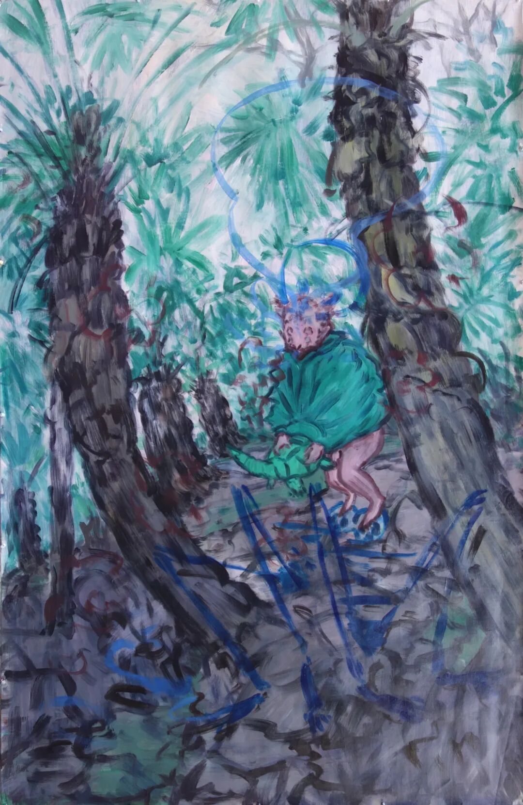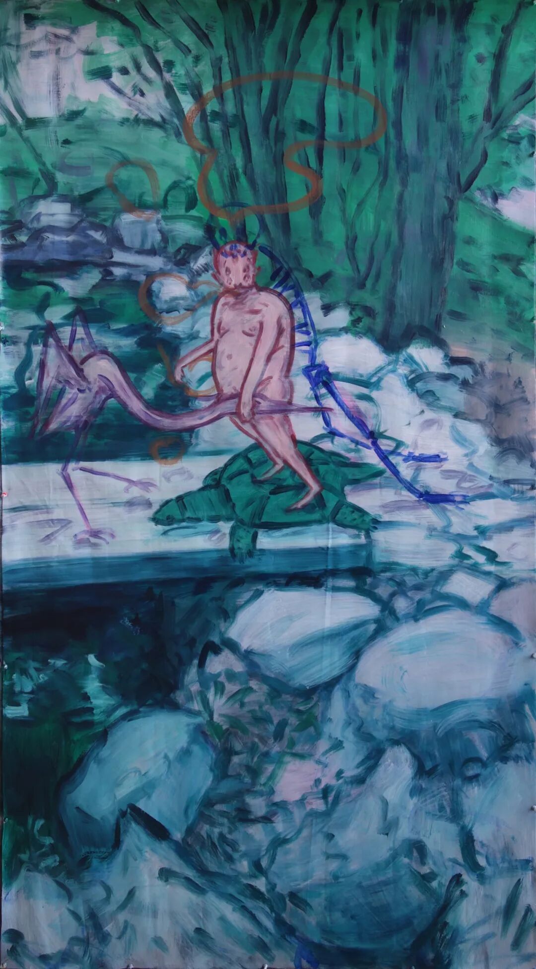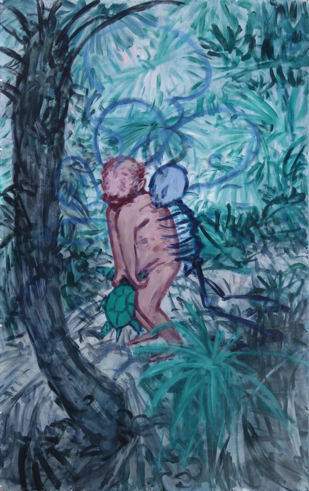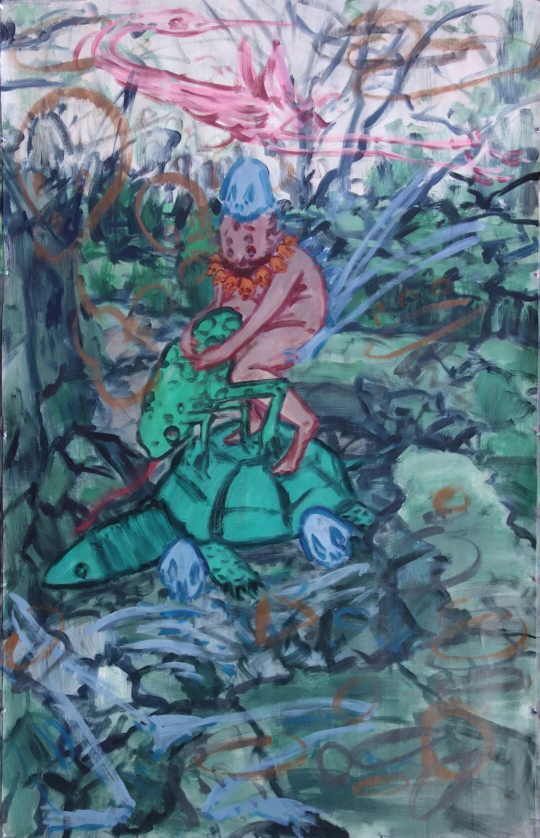 近期他的画,依然是“用不完的绿色”,不一样的是加入了对道家“不甚严谨”的学习笔记,唵风、仓宫、骷髅、少年、鸡、王八、仙鹤反复出现在画面里,还有几缕勃起的蓝色线,生硬地放置在画面前景消解着具象叙事。