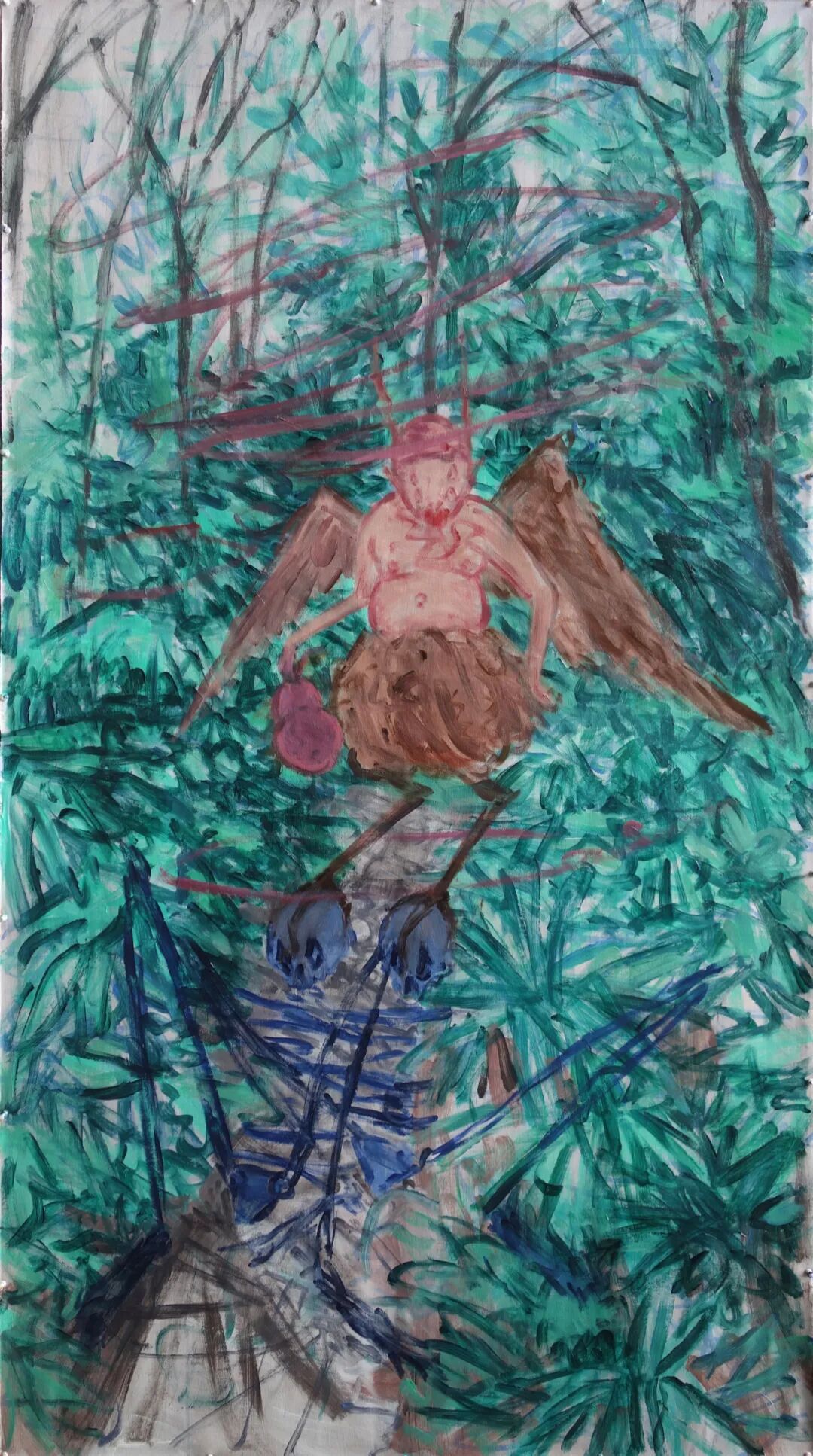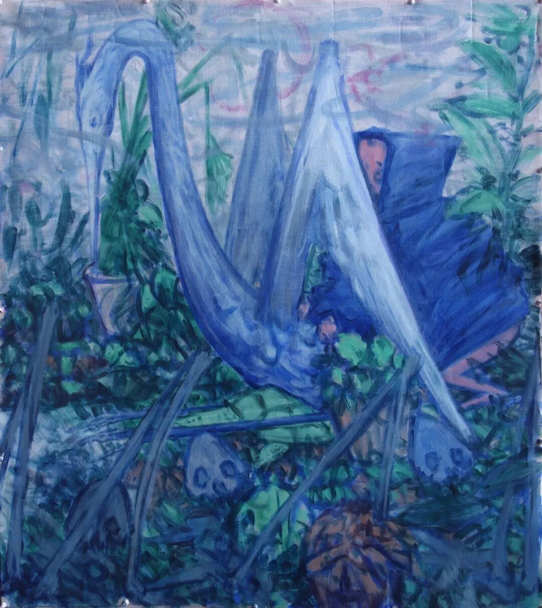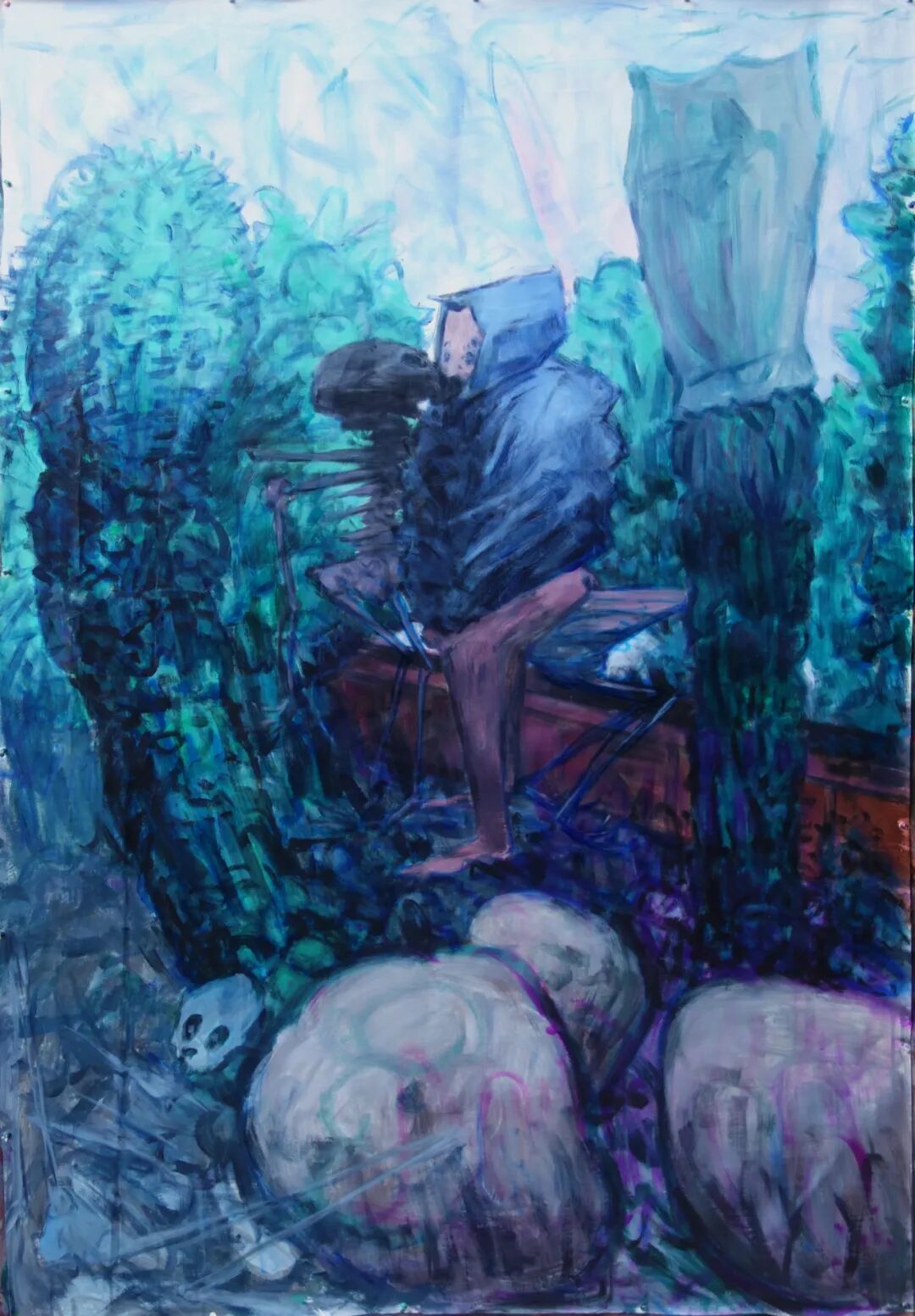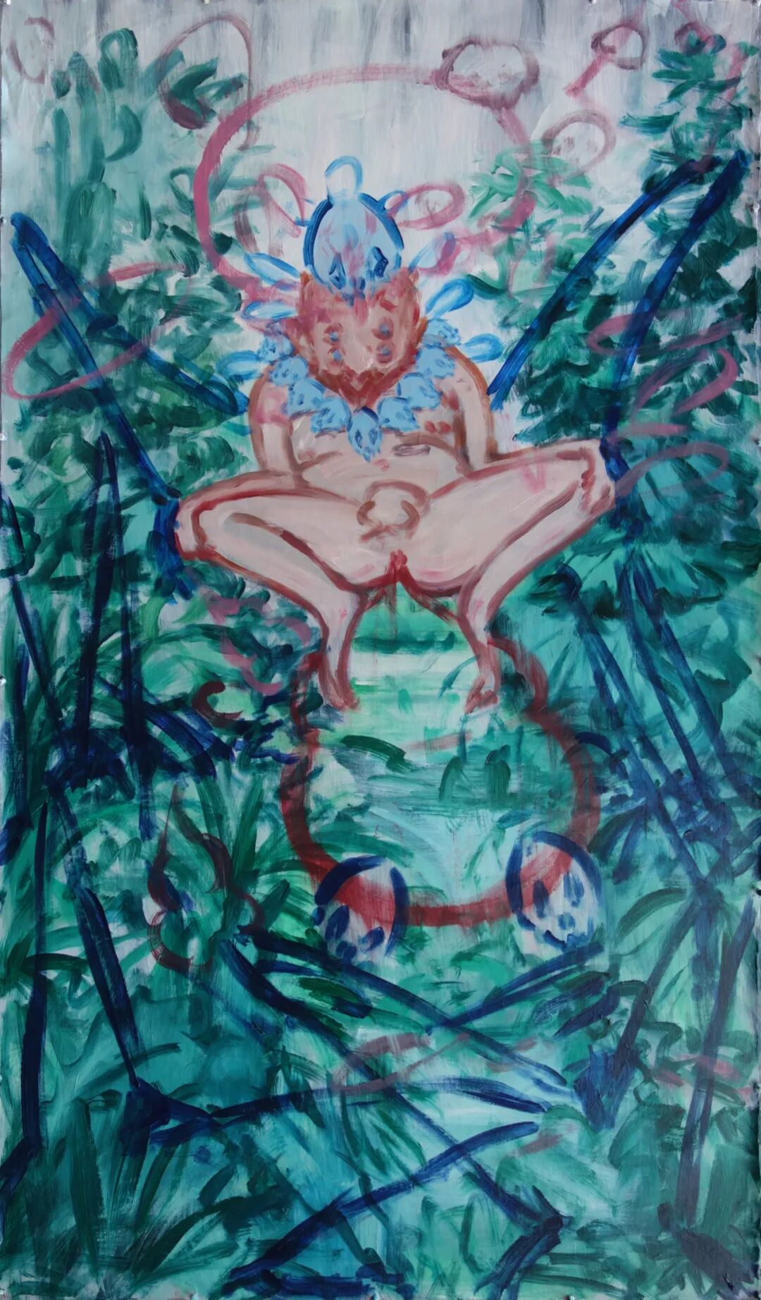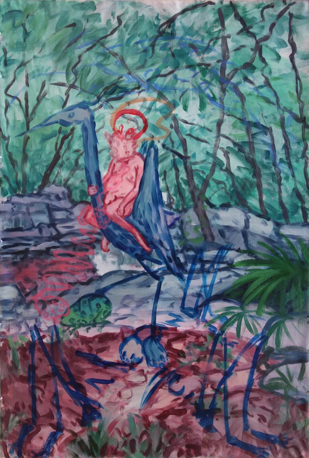 近期他的画,依然是“用不完的绿色”,不一样的是加入了对道家“不甚严谨”的学习笔记,唵风、仓宫、骷髅、少年、鸡、王八、仙鹤反复出现在画面里,还有几缕勃起的蓝色线,生硬地放置在画面前景消解着具象叙事。