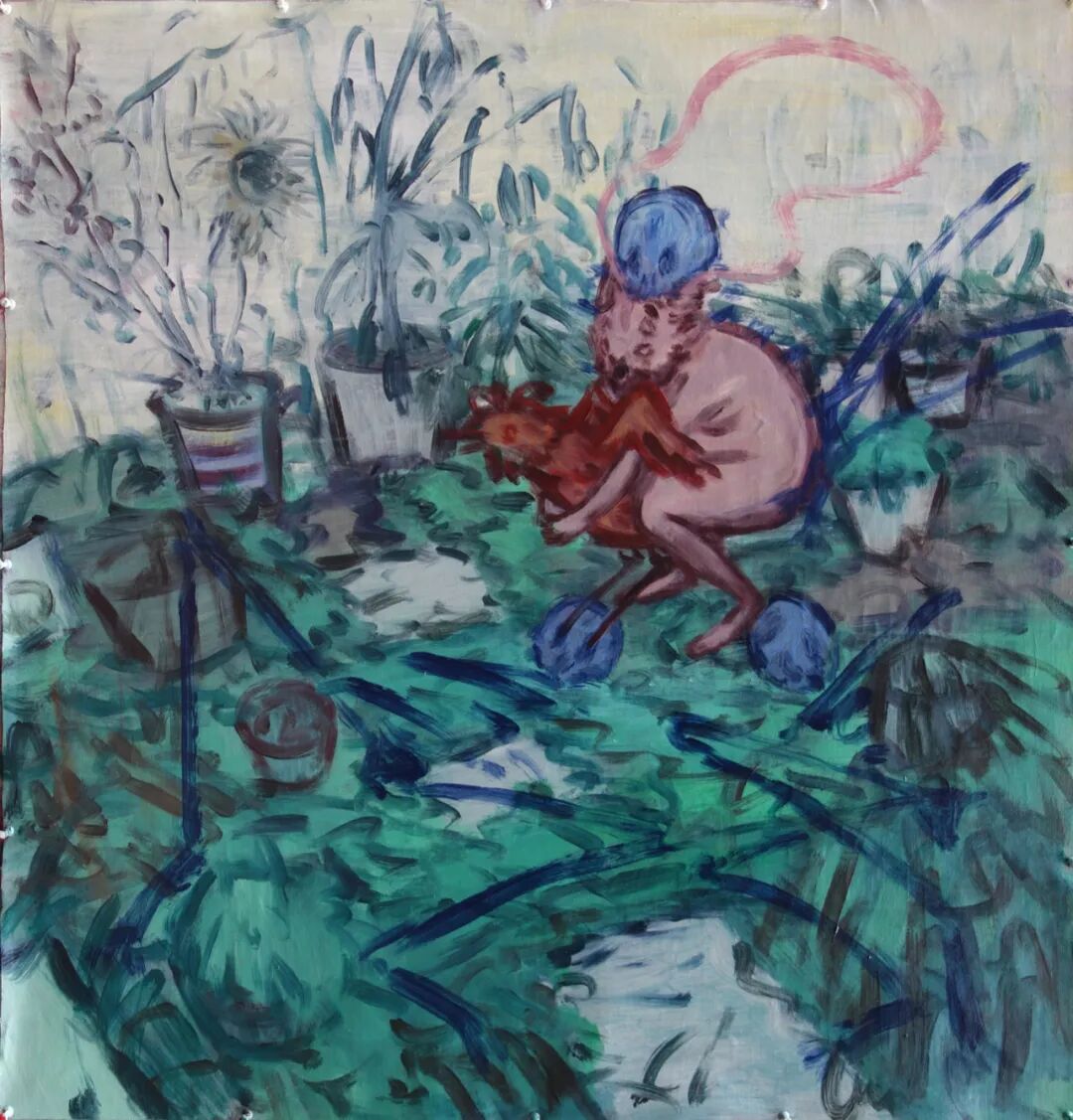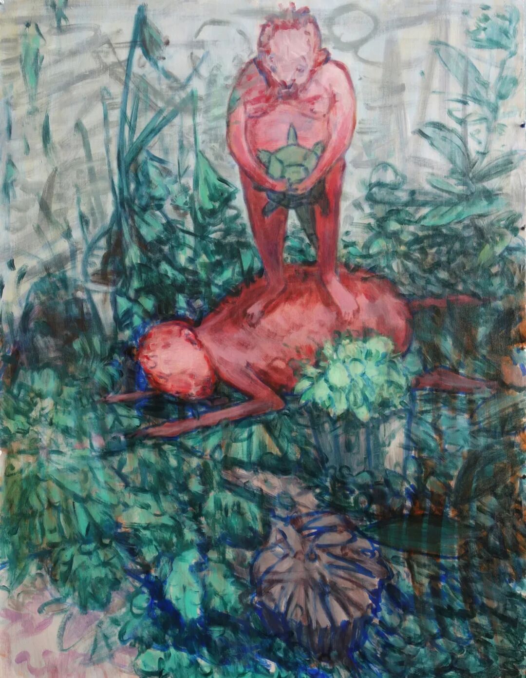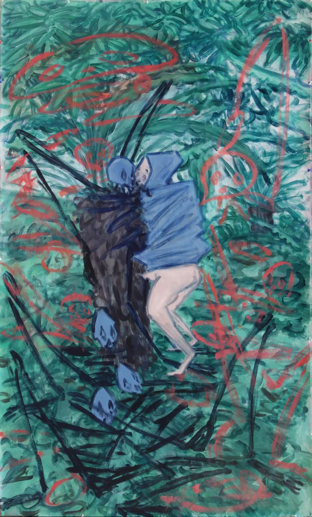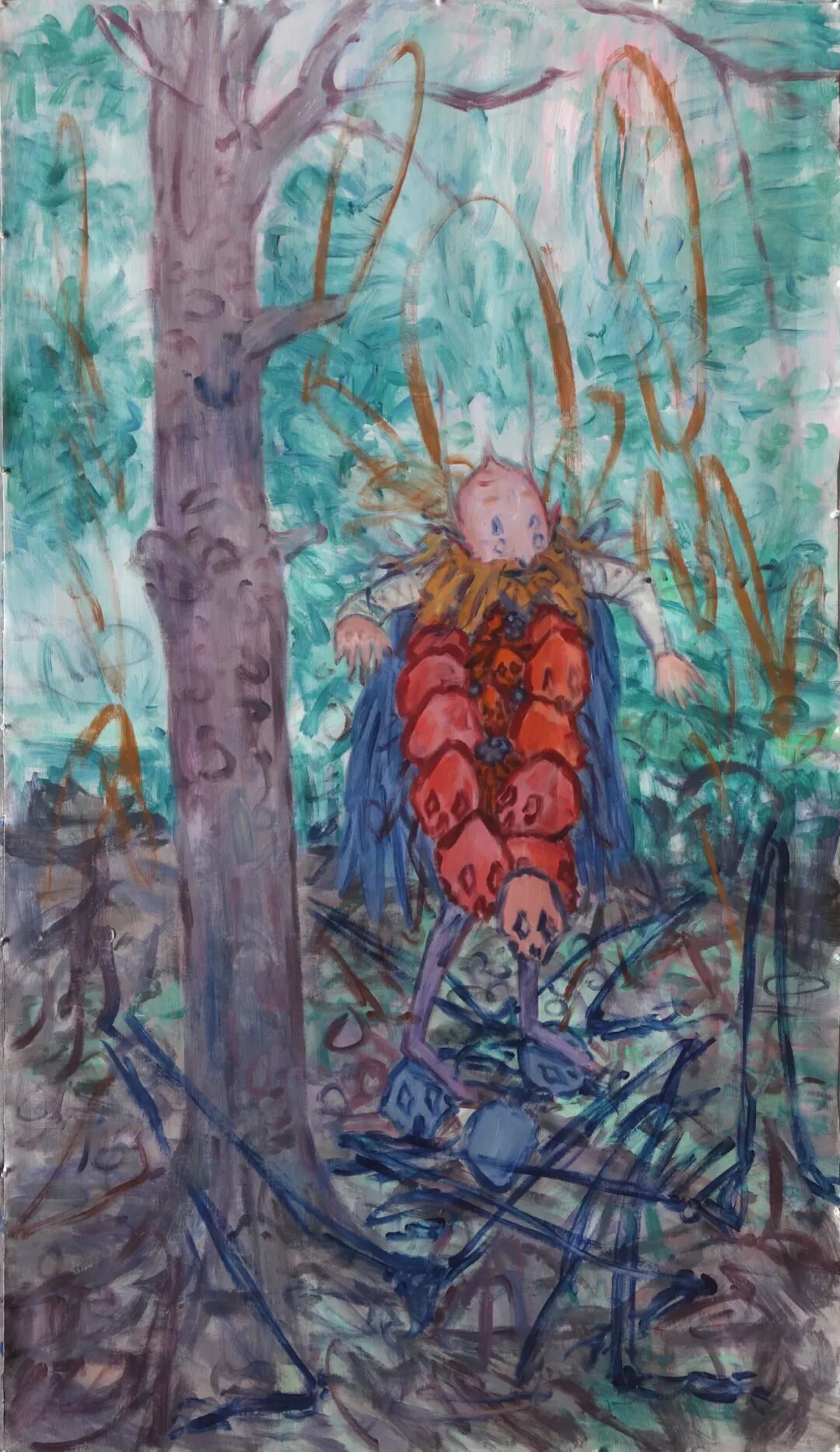 近期他的画,依然是“用不完的绿色”,不一样的是加入了对道家“不甚严谨”的学习笔记,唵风、仓宫、骷髅、少年、鸡、王八、仙鹤反复出现在画面里,还有几缕勃起的蓝色线,生硬地放置在画面前景消解着具象叙事。