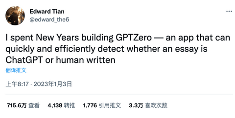 而要说第三方检测工具中,最受欢迎是GPTZero。这个工具出自一位22岁的普林斯顿大学华裔学生爱德华(Edward Tian)之手,今年1月3日上线,一周内就有超过3万人使用,一度导致程序崩溃。而推特上的演示视频,更是吸引了超过700万人次的观看。