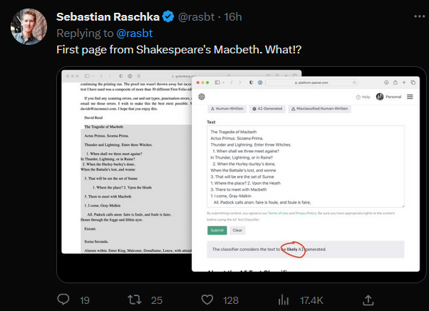 一名AI研究员Sebastian Raschka用莎士比亚《麦克白》的第一章测试该工具,得到的评估结果是“非常可能”是AI创作的。Sebastian 在推特有14万粉丝,他贴出截图后评论区有人戏谑道:“电影灵感:ChatGPT是一个时空穿越者,实际上人类的创作语言从一开始就是由它影响。”