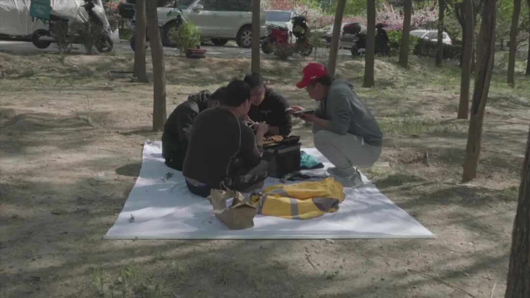 最新文章2023-06-24 用穿插在作品之间的真实经历,勾勒社会背景与创作之间的关系 近20年来互联网飞速发展,互联网、人工智能和大数据产生新的经济模式,“平台经济”、“零工经济”成为当下热议的话题。 同时数据也将各种人的需求勾连起来。中国拥有全世界数量最多的用户,也成为了全球最大的人工智能与大数据的实践场。 互联网中的“众包”“分包”服务不断加速我们的生活,一线城市几乎变成了一个延申的大工厂,外卖重组了这个车间的“食堂”,“物流”变成前线的补给部门,依旧用着最简单的方式完成食品分配。 在“物”的两头,人被平台和数据连接着,有句笑话很贴切:“小哥就是写字楼员工的饲养员”。 沿着公路,人们进入了城市,进入了工地,进入了工厂,他们的孩子进入了网络。 建造基础设施的人很可能也是基础设施的一部分。 数字平台是一种高效的管理方式,同时还为消费群体创造出“新的生活方式”,为生产者制造新的劳动岗位。 “外卖员”进入国庆的“当家作主”花车方队,疫情期间对全社会产生了巨大的贡献,在社交媒体上也常以“见义勇为”的形象出现,最辛苦的行业,往往被官方赋予最积极的社会形象。 “外卖小哥”赢得了尊重,但生活中依然难以摆脱不稳定的命运,还是在用自身的遭遇,去回应那些并没有多少改变的老问题。 过去我们做了很多“社会介入”的作品,疫情这几年,户外空间实践有很多限制,但多了更多思考的时间。 大学本科毕业时,我们的作品是对城市边缘一个旧家具市场的考察创作,社会学调研作为基本的背景叙述;姜可琪的研究生毕业作品,背景是与拆迁现场中不同身份的人之间的对话;而这次的外卖员系列作品也是如此,我们希望用穿插在作品之间的真实经历,勾勒社会背景与创作之间的关系。 ——姜可琪&赵华 白纸 作品介绍:“数字劳动”对劳动关系的颠覆,超出了现有的劳动法框架。在北京发生工伤事故的一名外卖员,却发现自己的劳动关系被属于一家重庆的劳动派遣公司,这家公司距离事发地点 1750 公里,法律工作推进异常艰难。从“农民工”时代到“数字工”时代,一份受到法律保护的工作直到今天都未被兑现,甚至还需要面对更加复杂的社会状况。影像内容是在外卖员的保温箱后系一张空白纸片,最开始的A4大小,像是没有任何内容的合同,直到慢慢变大成为旗子,在他们的工作过程中随着速度的加快逐渐起飞。 材料媒介:影像 作品时长:6′21″ 从A4纸开始,逐渐变大,最后变成一张两米的白布。在做的过程中,我们和外卖员也逐渐熟络起来,外卖员之间也在互相交流各种经历。 野餐这些主意是外卖员想的,他们对这块“白纸”逐渐变大也有自己的视觉认知,我们觉得野餐挺好。正好留下的油渍也符合作品的表达。这件作品陆续做了3个月,开始要表达的内容也没那么重要了,时间可以冲淡作品的观念。 红雾 作品介绍:一名外卖员在几乎全黑环境中完成摩托的烧胎表演,轮胎与地面摩擦产生的烟雾在红色的灯光下,像一层血雾。 材料媒介:影像 作品时长:2′28″ 强化地面和轮胎摩擦的感受,把很大的力量,在短时间内高速释放。开始构思的是车手在一个密闭空间中,类似一个黑箱,红色的尾灯可以照亮烟雾,有一种科幻感和危机感。车子在奋力向前,但丝毫不能前进。 饭盒 作品介绍:将一块印有外卖订单的石碑加工成外卖的餐盒。 材料媒介:影像 作品时长:3′24″ 团建 作品介绍:外卖员在驾驶的过程中精神高度紧张,而游乐场的碰碰车项目,让他们不必操心驾驶中的意外碰撞,肆意享受其中的撞击和快感。“撞击”这一感受,本身也与他们工作中的安全息息相关。 材料媒介:影像 作品时长:3′52″ 外卖员为了提速而发生车祸,已经是很常见的事情,这种精神高度紧张的状态,需要得到释放,而公园里的碰碰车与他们的工作行为完全相反,在这种撞击中,反而是一种安心、发泄和开心。 不需要任何脚本和安排,依然是简单的“驾驶”这个再熟悉不过的操作,人物状态本来就是一种表达。做之前跟外卖员聊天,有一个哥们说,这个让他想起之前几个大公司为了“抢占”骑手互相打的价格战;游戏结束之后,一名外卖员在没有任何台词安排的情况下,说出“一会开车可不敢这么撞”,大家哄堂大笑,当下的体验与自身经验就这样勾连在了一起。 目标拆解 作品简介:这是一个关于设计者和被设计者的故事,共享一个系统的同时也有着相似的命运,各种职业被系统紧密的联系在一起。市场和消费者带来的压力,也伴随着系统逐层施加在为系统服务的人身上,程序员也需要设计出更加精巧的推销算法。外卖员用网线拉扯着程序员,对他施行“车裂”这一刑罚。商鞅设计出车裂这种刑罚方式,同时也是第一个受用这个制度的人。程序员一样,在这个过程中被“撕扯”。 材料媒介:影像 作品时长:5′07″ 这个作品的方案来自一名程序员,在2020-2021我们参加了很多关于外卖员话题的讨论,那年也是外卖员这个话题最火的一年。在一次会议上,主持人问大家都是来自哪些行业或者专业的。多数来自法律,少数来自社会学和媒体,还有几个纪录片导演,其中只有一名程序员,他站起来发言:“我有时候在想作为程序的编写者,是不是应该对这些(外卖员)事情,在程序编写的时候有伦理上的判断”。这也是我们一直好奇的地方,这种设计者和被设计