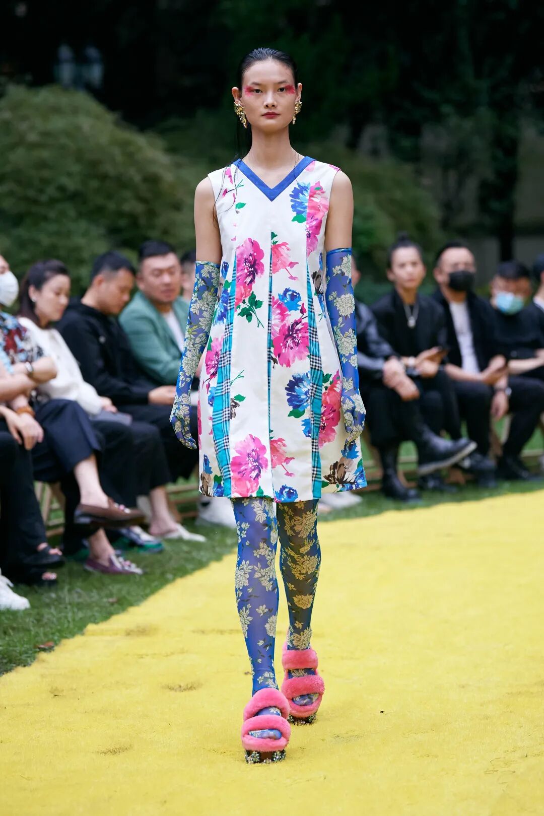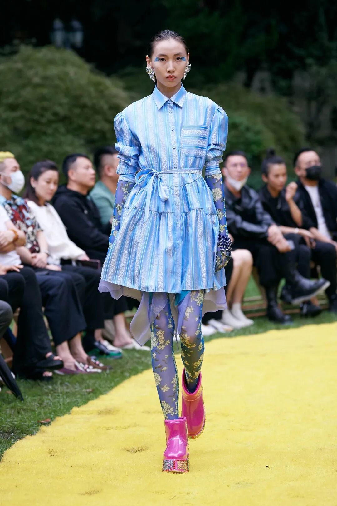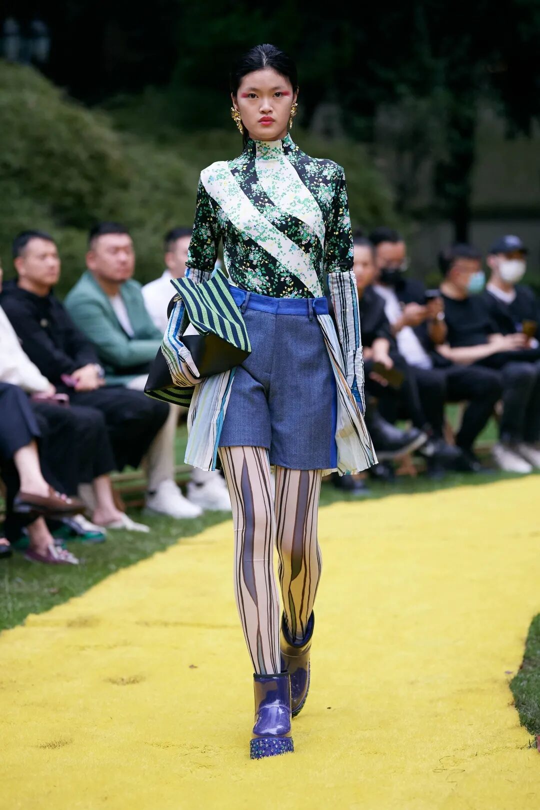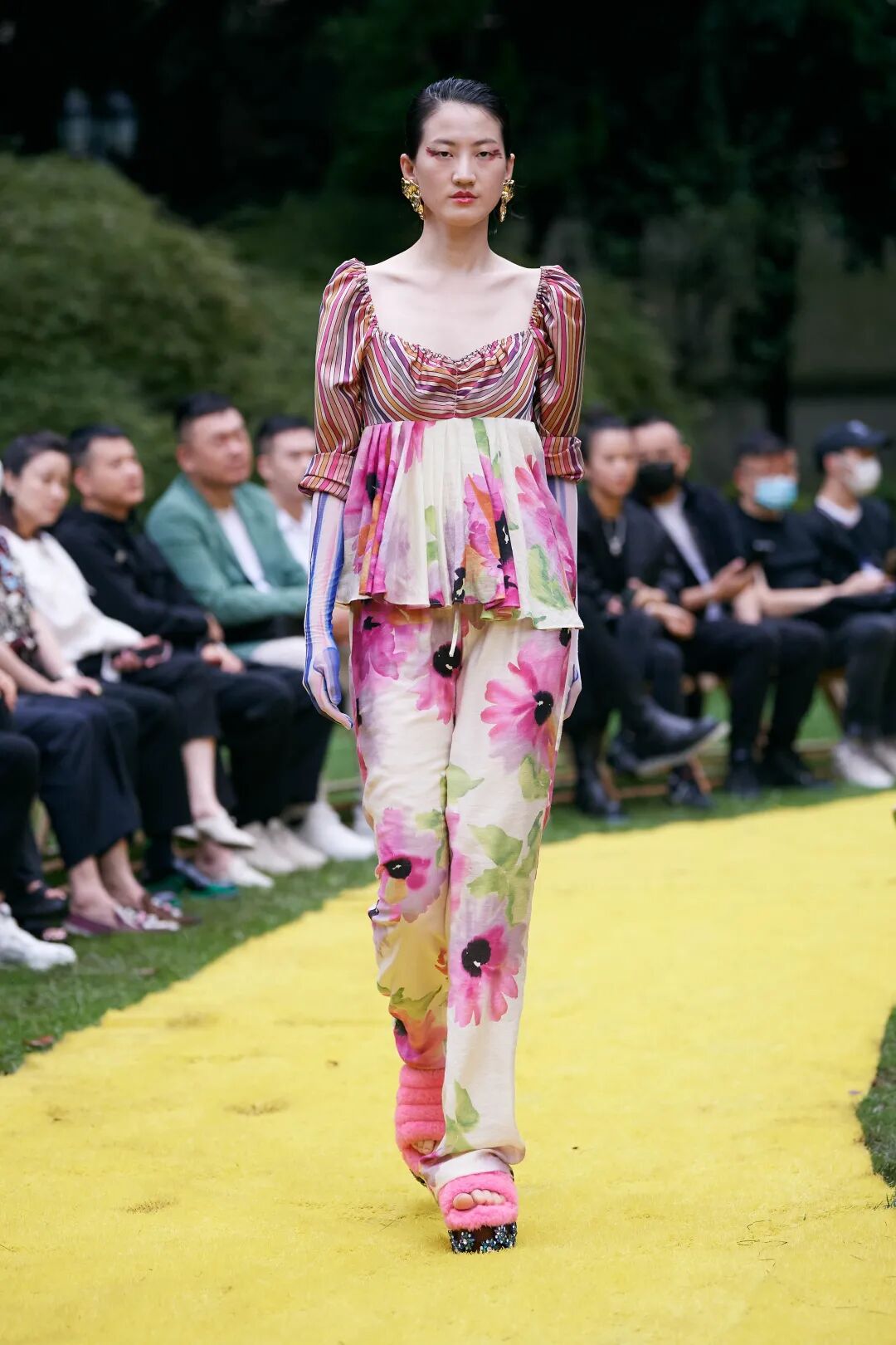 SHUTING QIU运用大量的不对称和廓形设计去展示女性独立强大的硬朗的一面,同时采用鲜明的色彩碰撞和丝绸纺织刺绣工艺,以及印花元素去展现女性内心浪漫温柔的一面,这种看似冲突强烈的对比,在绿树与领馆高墙的掩映下尤为和谐。