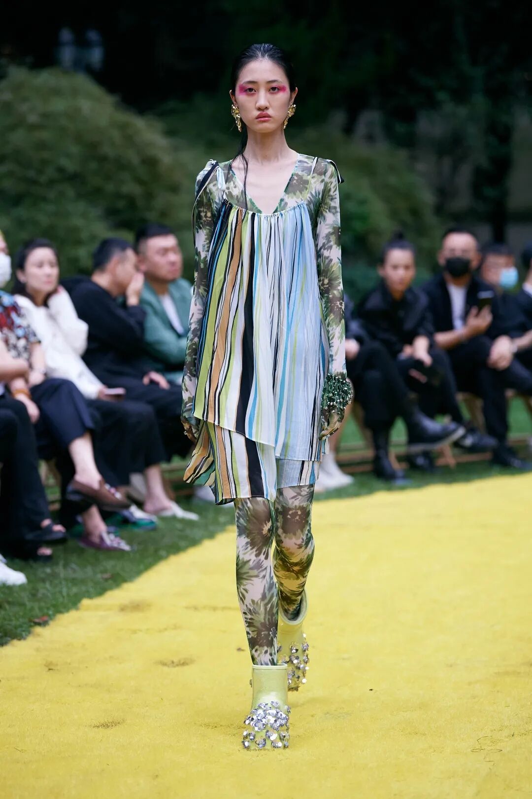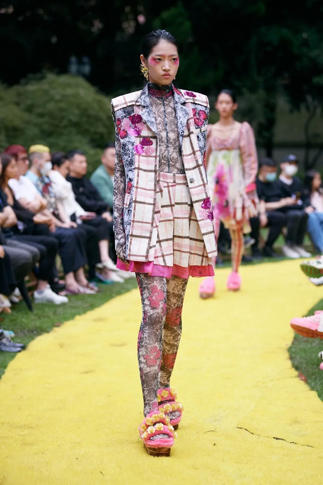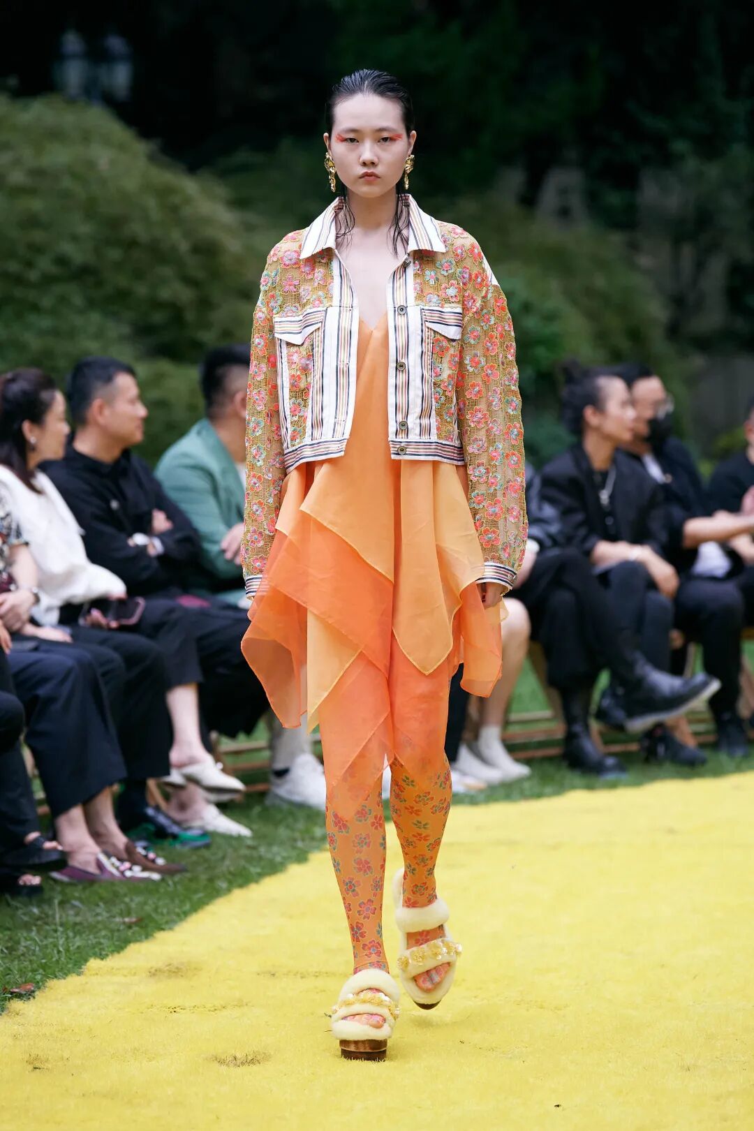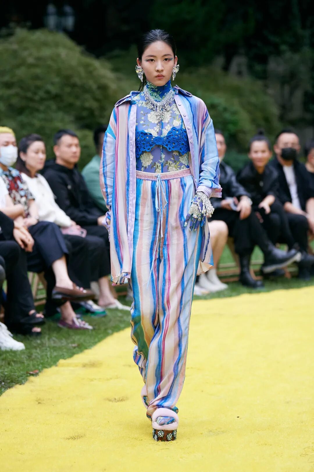 SHUTING QIU运用大量的不对称和廓形设计去展示女性独立强大的硬朗的一面,同时采用鲜明的色彩碰撞和丝绸纺织刺绣工艺,以及印花元素去展现女性内心浪漫温柔的一面,这种看似冲突强烈的对比,在绿树与领馆高墙的掩映下尤为和谐。