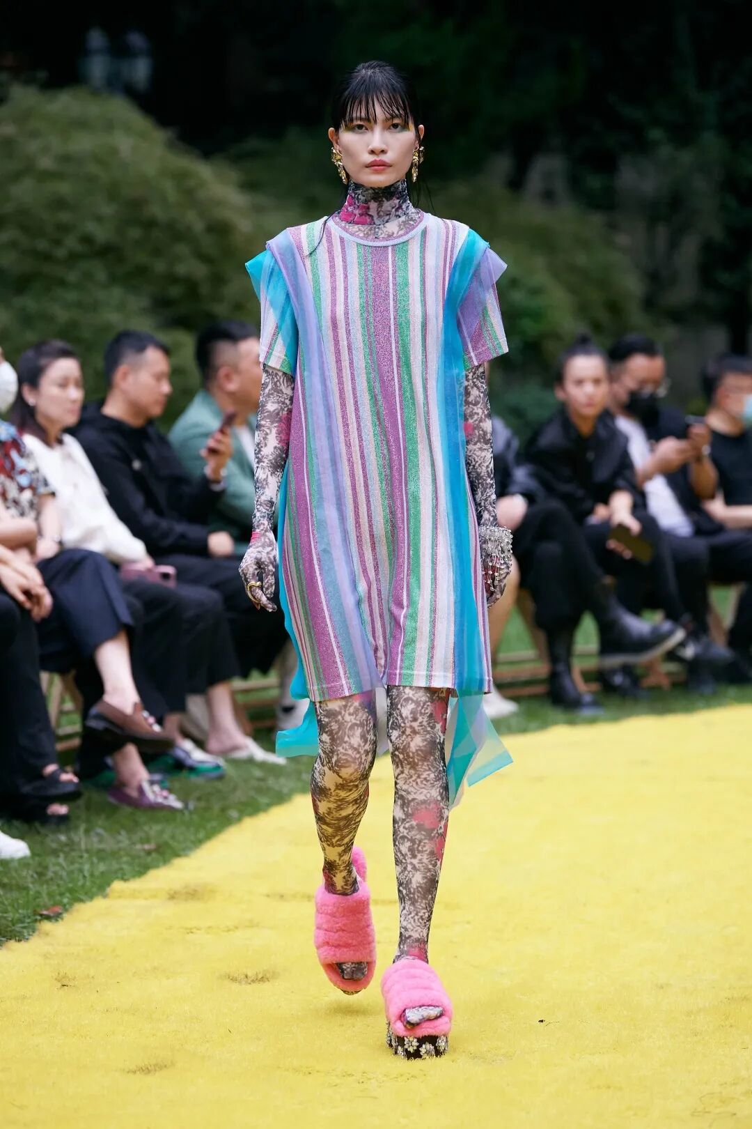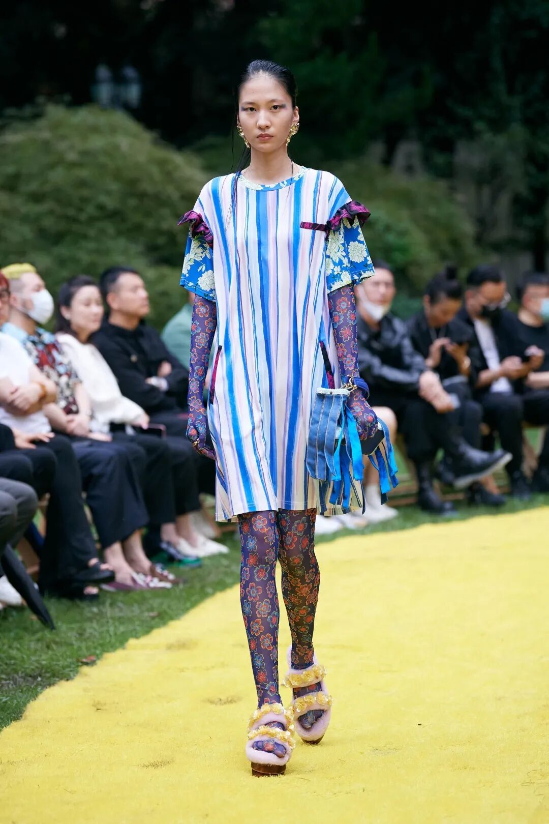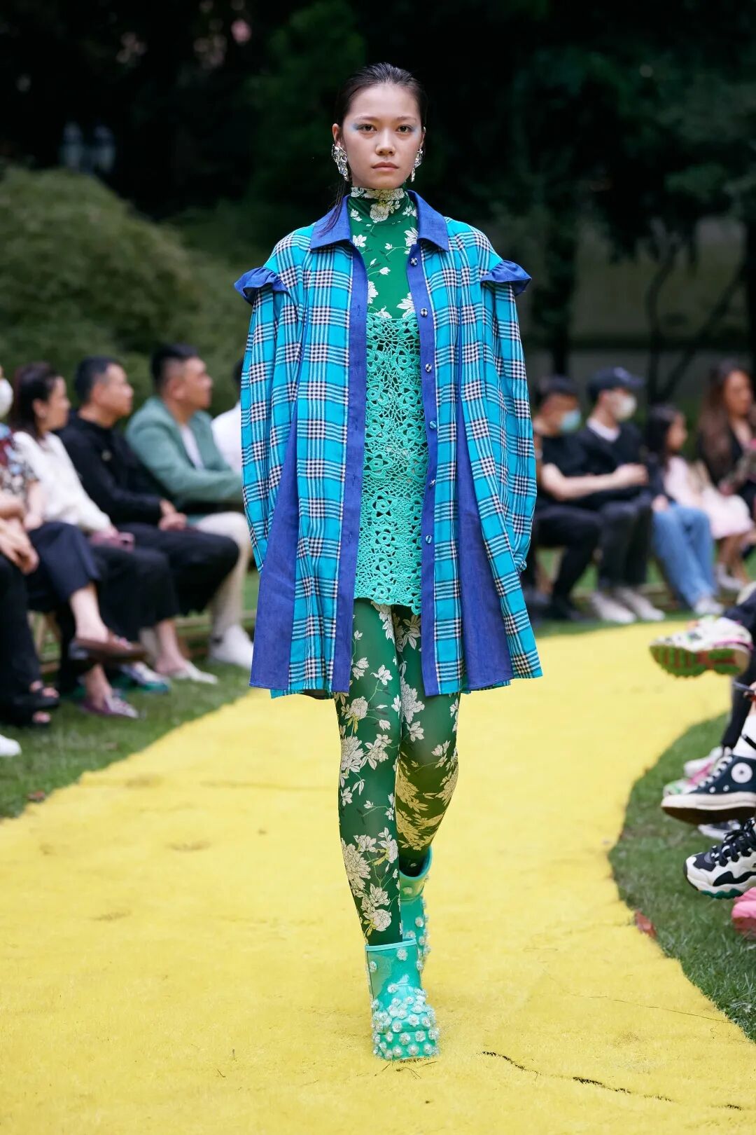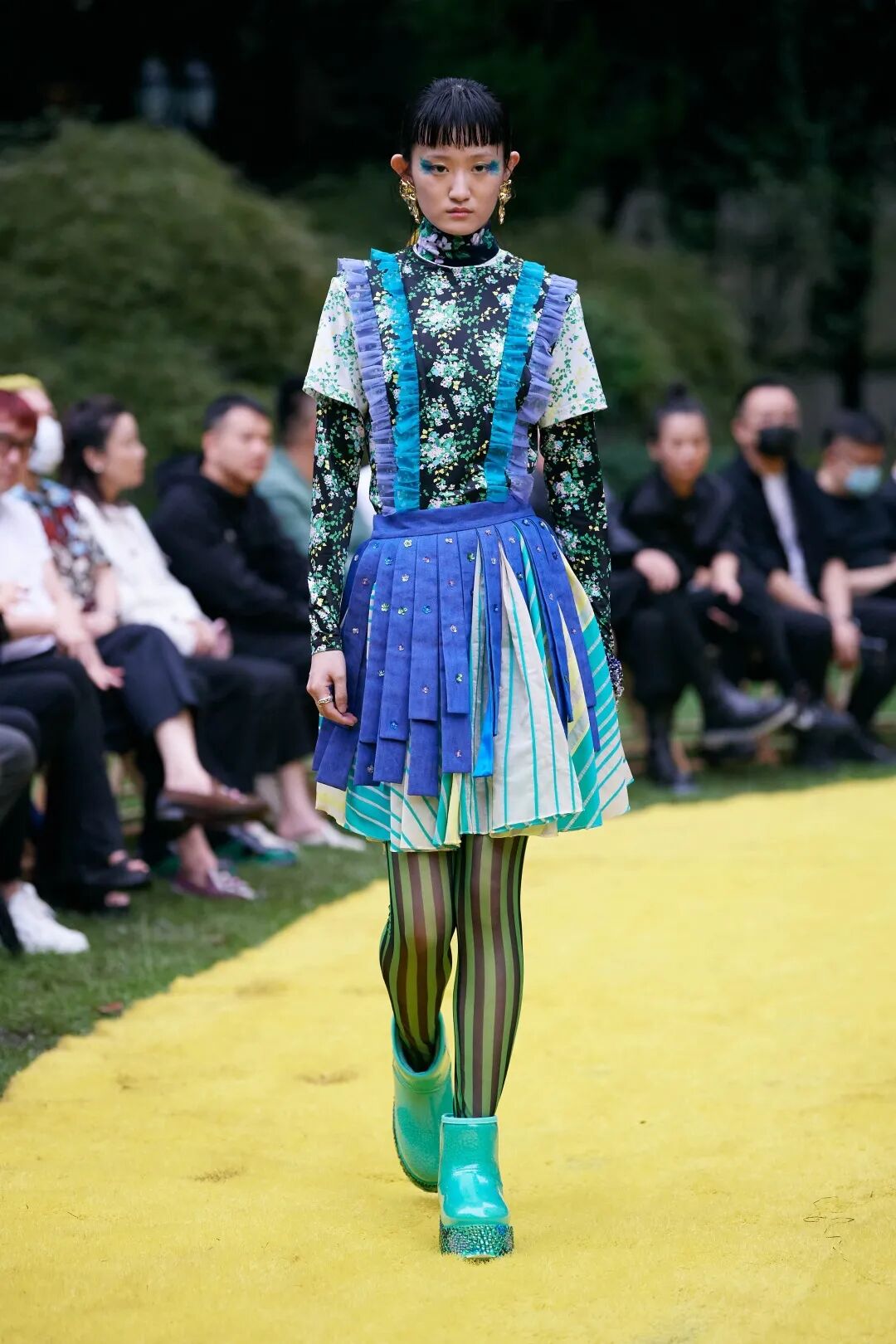 SHUTING QIU运用大量的不对称和廓形设计去展示女性独立强大的硬朗的一面,同时采用鲜明的色彩碰撞和丝绸纺织刺绣工艺,以及印花元素去展现女性内心浪漫温柔的一面,这种看似冲突强烈的对比,在绿树与领馆高墙的掩映下尤为和谐。
