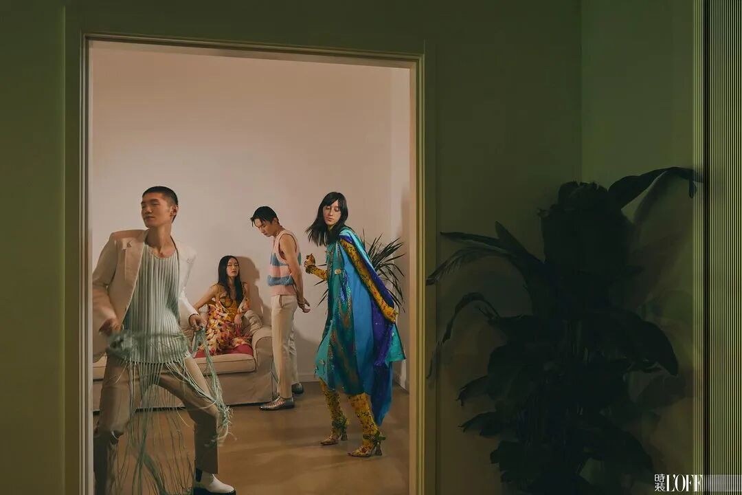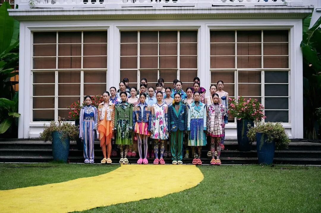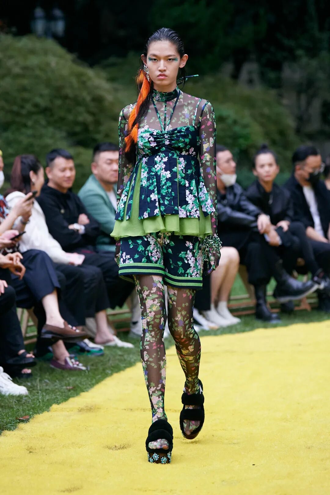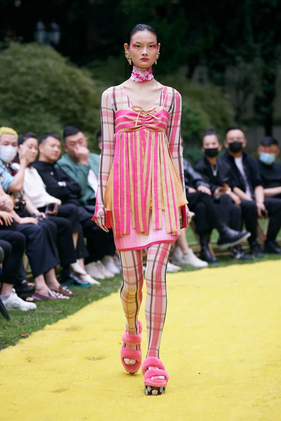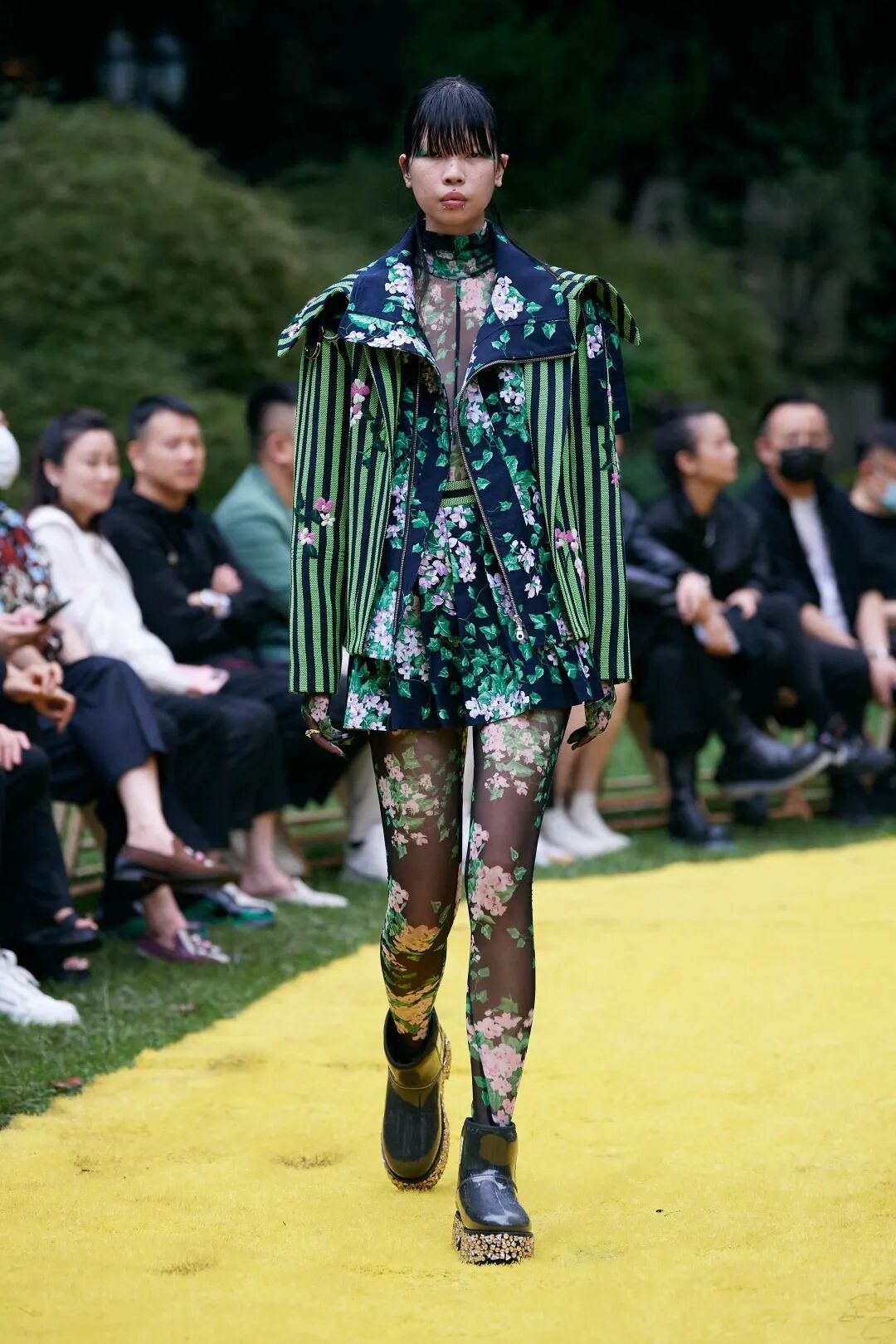 SHUTING QIU运用大量的不对称和廓形设计去展示女性独立强大的硬朗的一面,同时采用鲜明的色彩碰撞和丝绸纺织刺绣工艺,以及印花元素去展现女性内心浪漫温柔的一面,这种看似冲突强烈的对比,在绿树与领馆高墙的掩映下尤为和谐。
