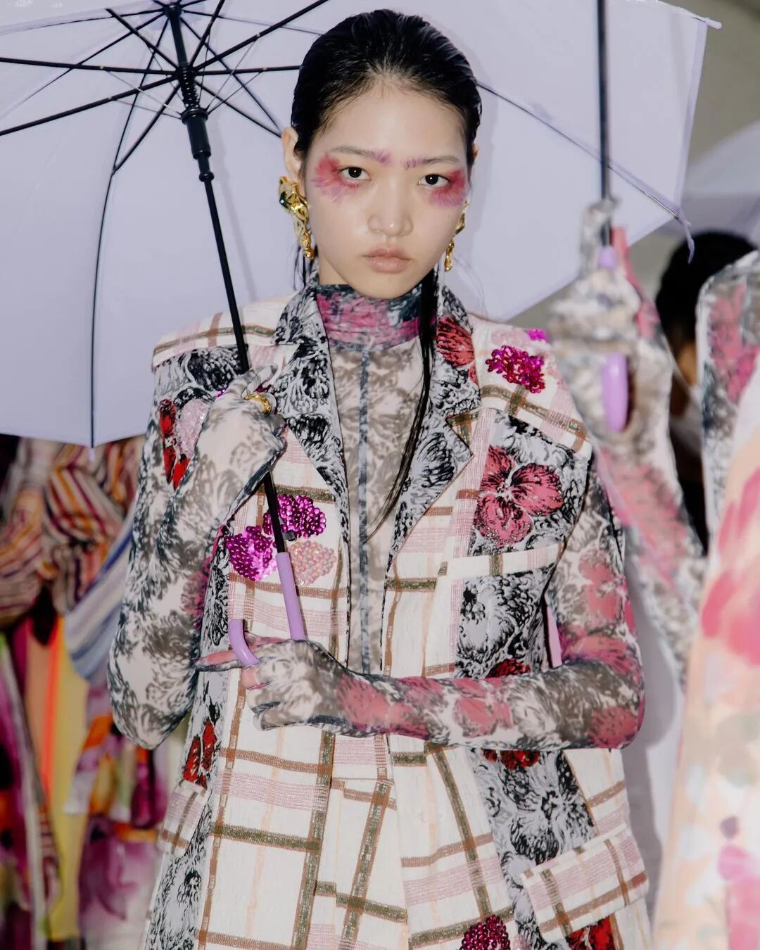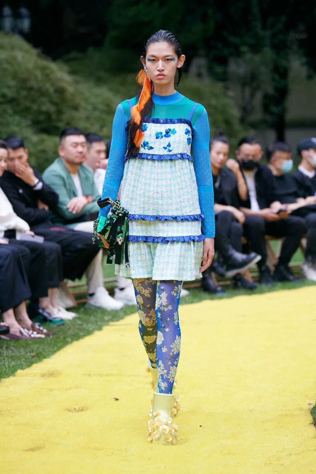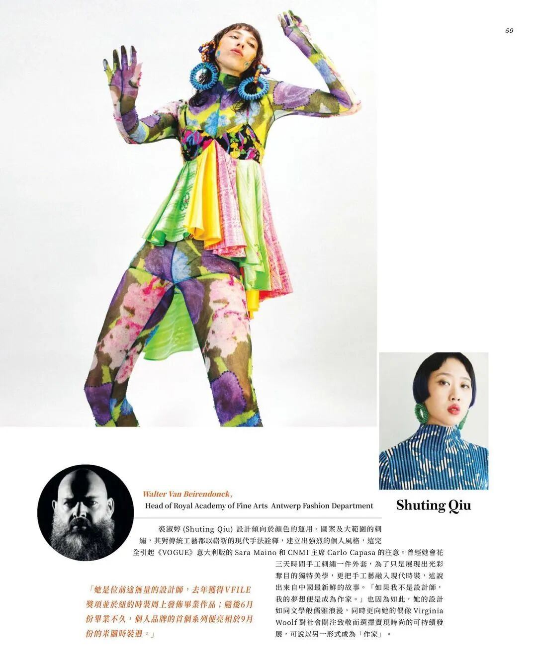 其设计中充满着对时尚实验性的探索。丰富的色彩、大量的花朵纹样、精致工艺的刺绣以及剪裁上的不对称让SHUTING QIU的作品丰满且具有个人风格。