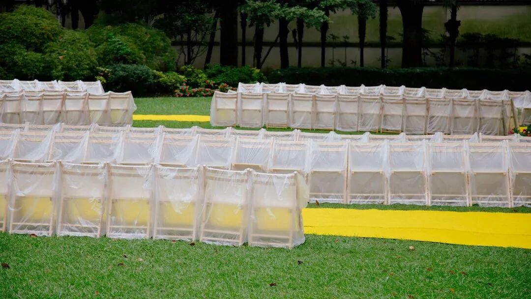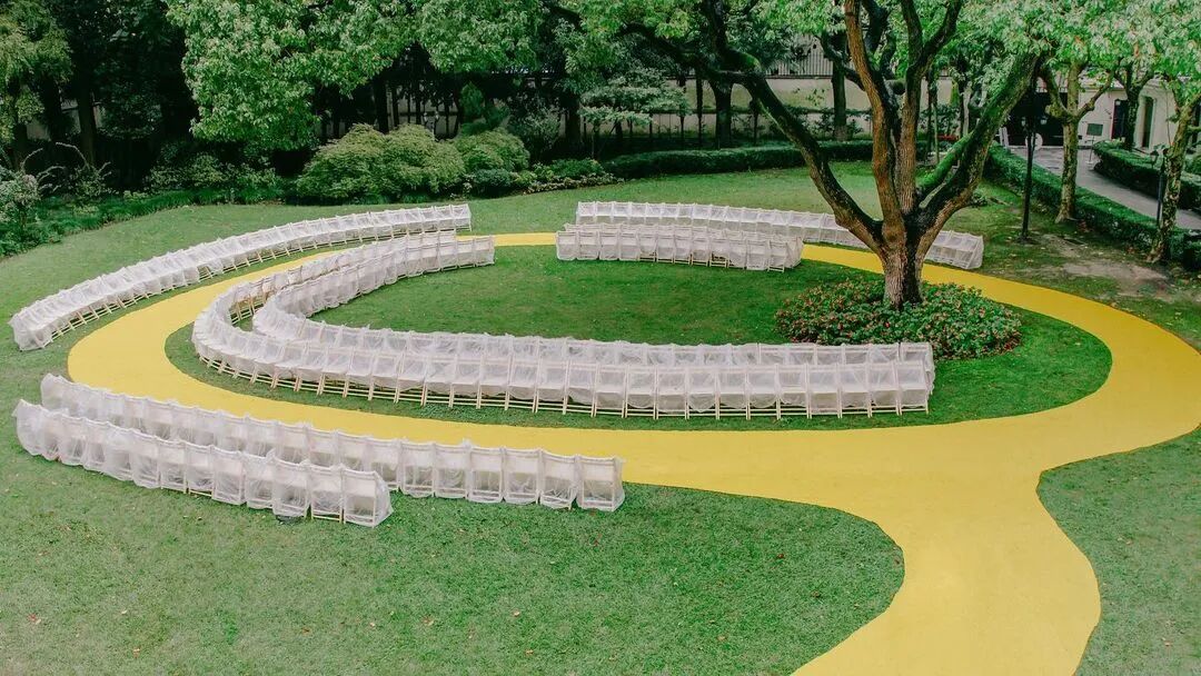一颗百年的香樟树下,来宾分列黄色的环形秀道的内外两侧,可折叠的柚木座椅透着沁人心脾的清香。