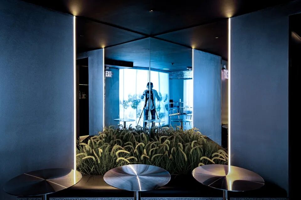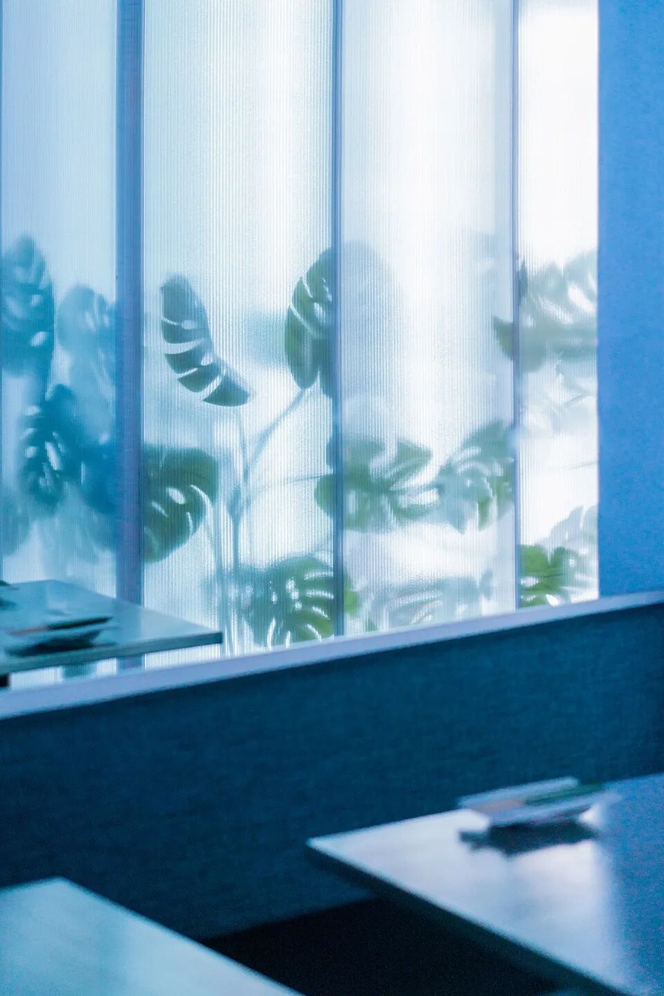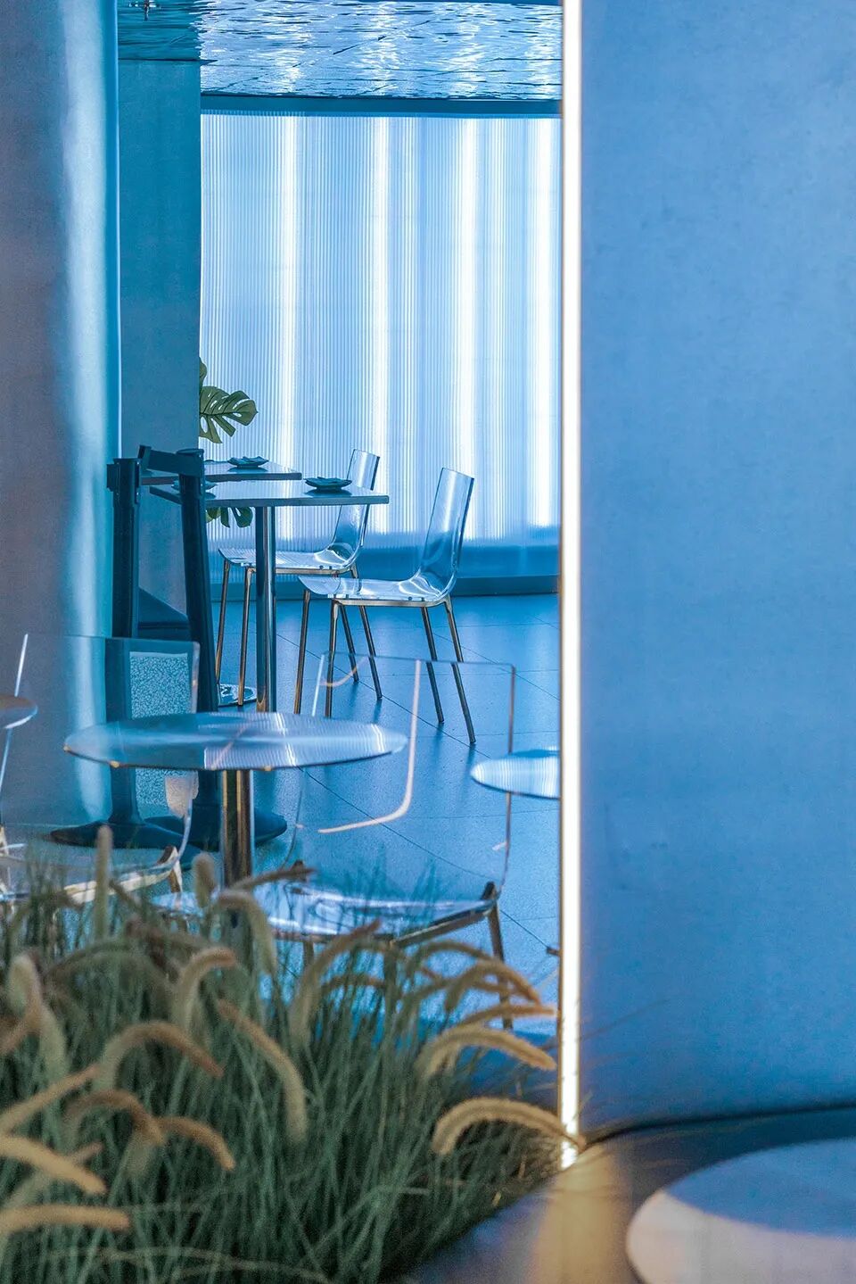 白天,这里提供日常餐饮,晚上,则变换成为酒吧。由外及内再到地下,我们创造出三处“光门”:第一处铺面的落地窗,白墙黑框一整面幻彩玻璃,在迷幻的颜色里反射出东村街景,也隐约透出店里吧台背景的灯光;而吧台则是第二处光门,LED灯条限定出一个四方的界面,界面内侧是由不锈钢钢板围合出的吧台空间,吧台背景的PC板从背面由暖色洗墙灯照亮;第三处光门是地下层由镜面、背光PC板、金属漆墙面和天花水纹板围合出的一个沉浸式蓝冷调空间。