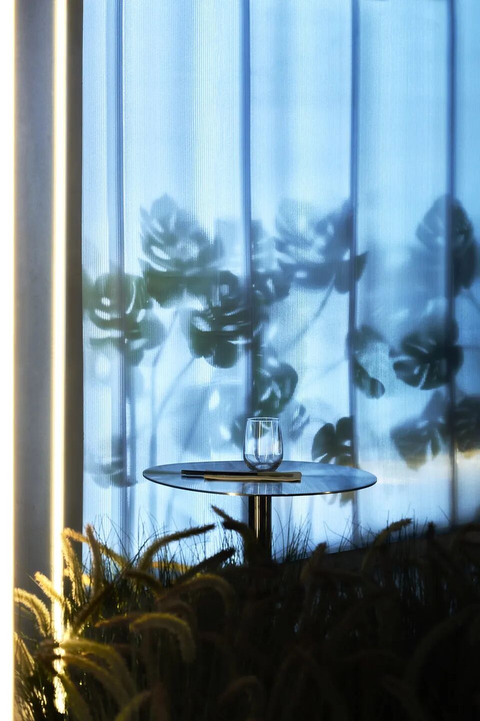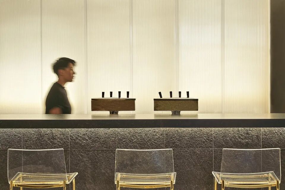 业主是一位毕业于中央美院的艺术家,其对设计的敏锐认知和创意想法为我们提供了诸多关键灵感,我们与业主达成一致:Dumpling Lab需要以一种非传统餐厅的氛围呈现。然而实验性与先锋性往往意味着客群体验感的牺牲,与其强调内容与容器的冲突,我们更希望通过对比的手法来达到风味与观感体验的双重刺激,更直白地讲,我们希望餐厅客在一个既简洁又略带迷幻和神秘色彩的空间内体验舒爽饕餮的舌尖沉浸。