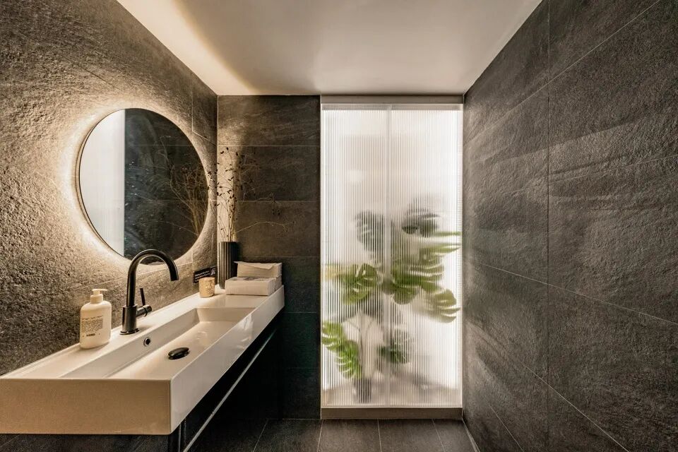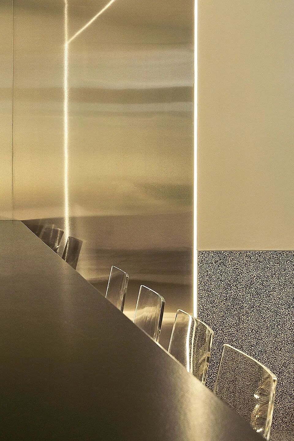 室内大部分采用非直射光源,槽灯、背光灯的应用强调出关键的设计元素,特别是PC板对背后的洗墙灯光进一步柔化形成若干亮点立面。我们采用了大量反射材质,不锈钢、水纹板、镜面、金属漆、岩板反射度各异,进一步丰富了光感的层次。虽然地上地下光感对比强烈,但相对均匀柔和的灯光最大化顾及到就餐舒适度。