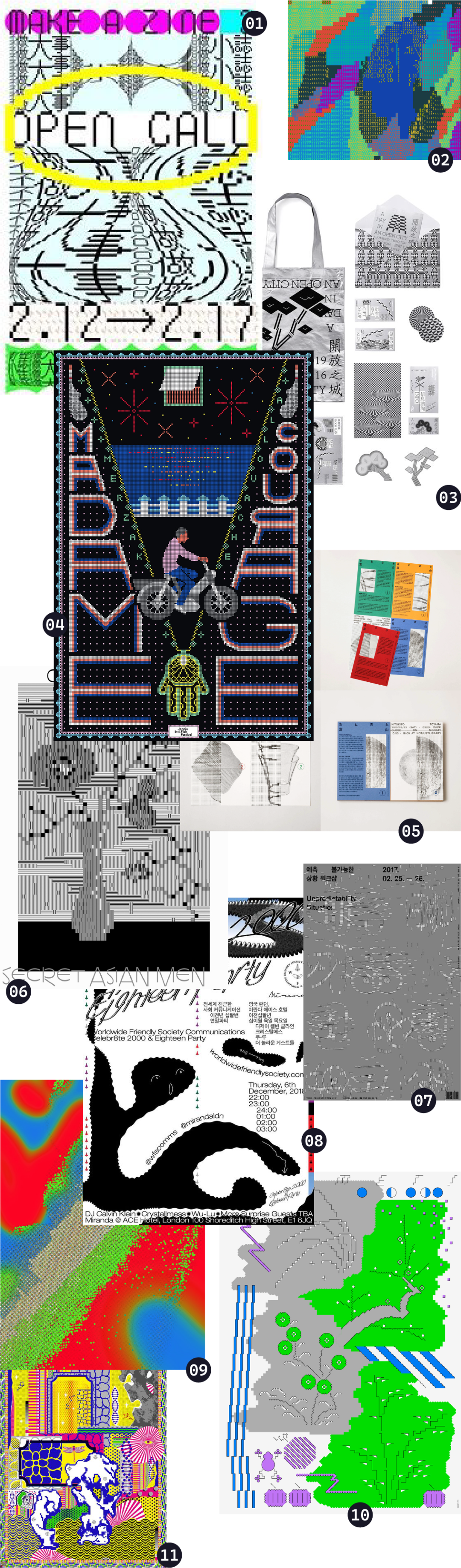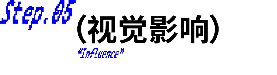 设备带来的图形“受限”跨越为 “不受限”,字形抽象化,图形元素化,融合锯齿状的外观,变形轮廓线,或是马赛克式的模糊处理,以极其强大的适配性出现在酸性设计、表现主义设计风格中,体现不受约束的未来感与形式之美。
