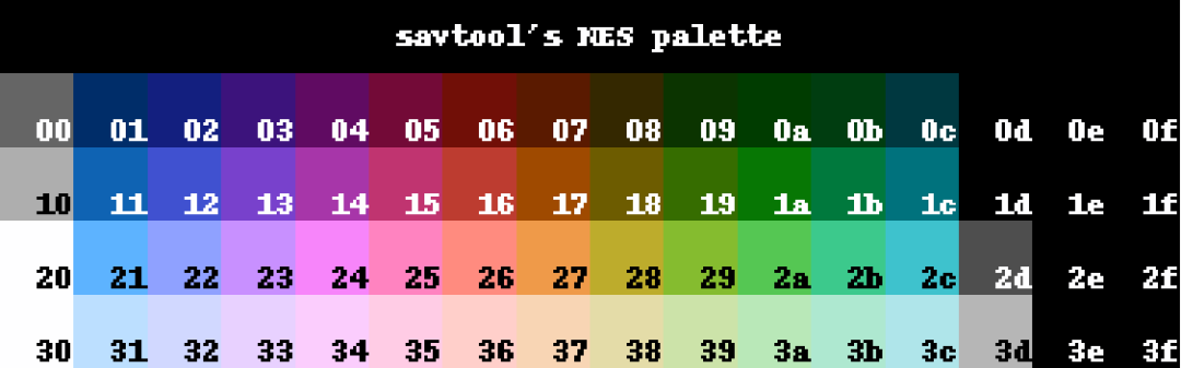 ▲红白机颜色色卡:受限于当时的技术手段,红白机可供使用的发色色号仅有52个(目前说法较多,52-56不等,另外黑色似乎也排除在外。)