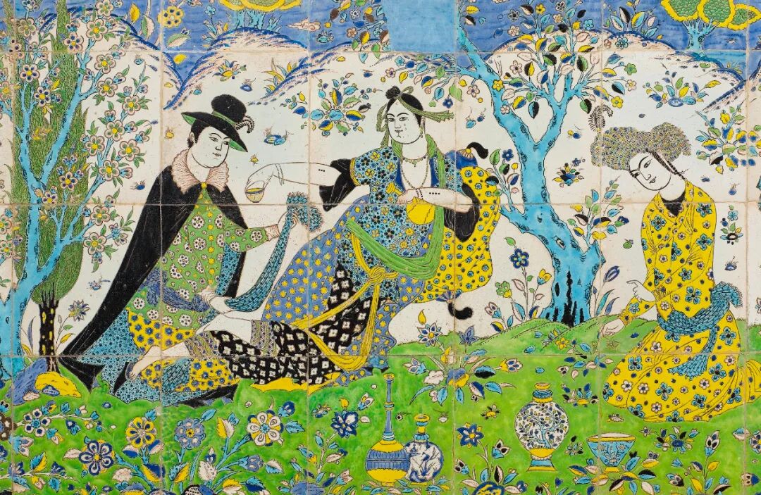 《花园雅集》Garden Gathering,1640-1650,伊朗萨菲王朝(Safavid dynasty, 1501-1736)瓷砖画(局部),高22.5厘米。纽约大都会艺术博物馆(Metropolitan Museum of Art, New York)。
