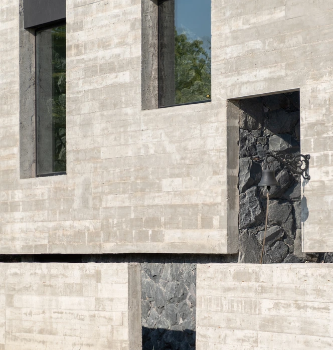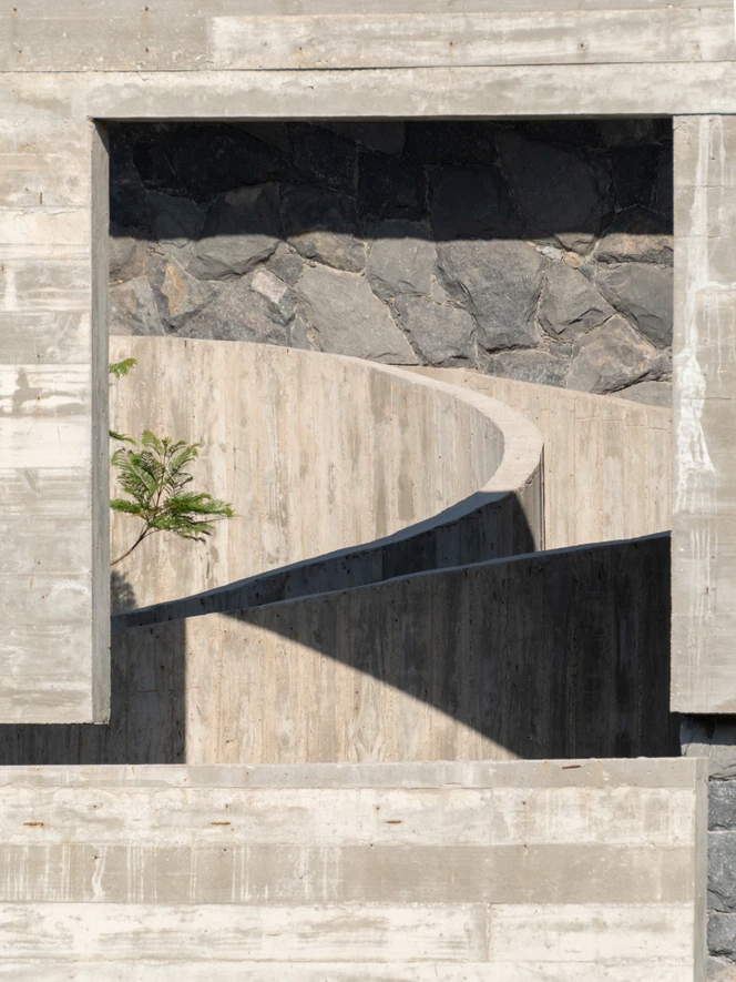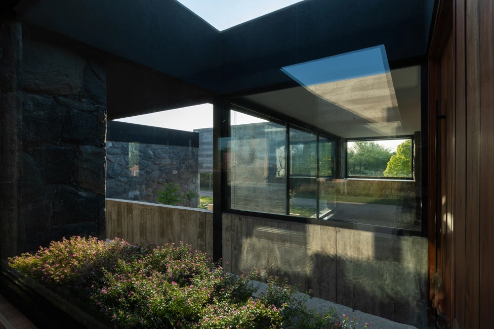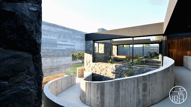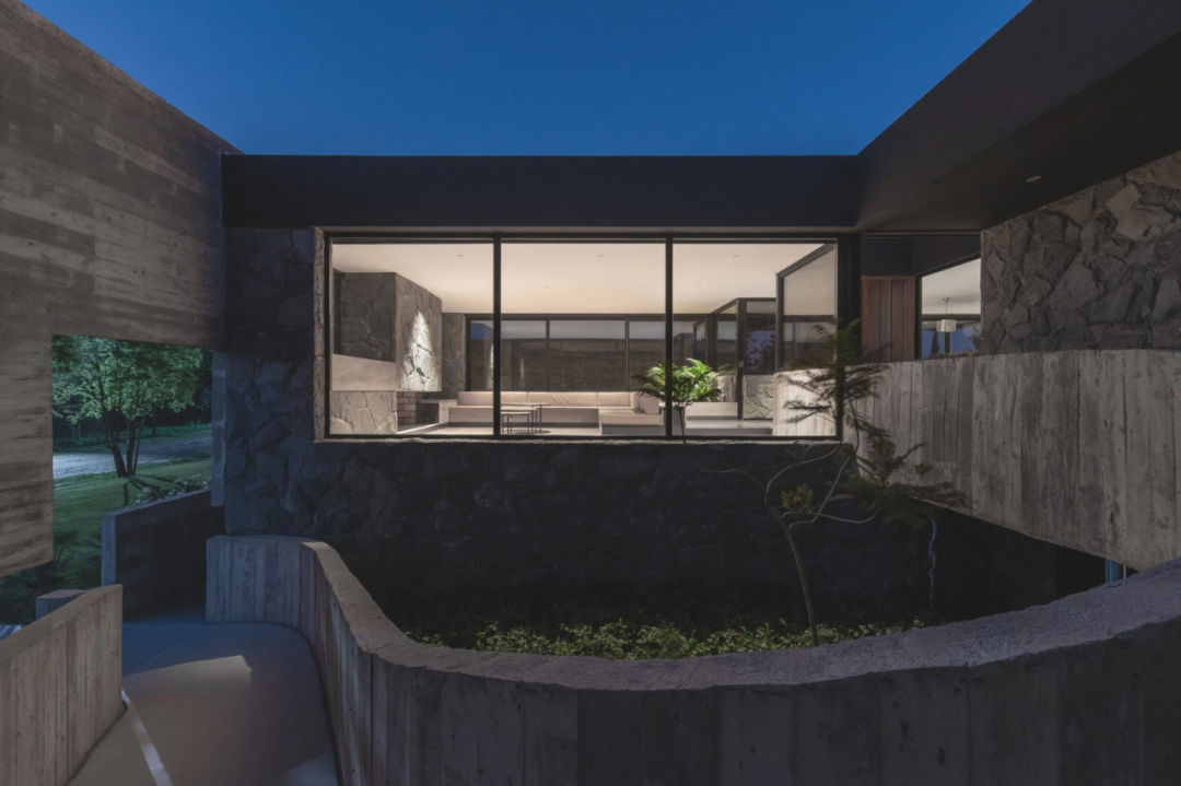 庭院是分隔和连接不同功能区的要素,也是形成连接室内外的互补空间,混凝土、石墙、绿植结合在同一区域给粗旷的混凝土增加了艺术性。