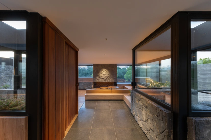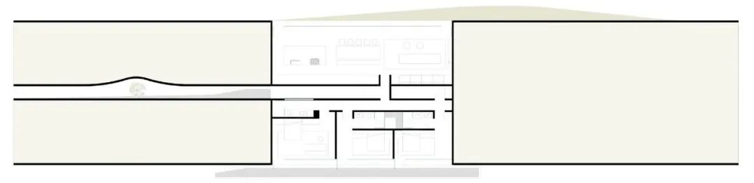 通往西北的坡道通向一条铺有烟熏木头的走廊,沿着住宅的北侧延伸,连接办公室、浴室和客房。