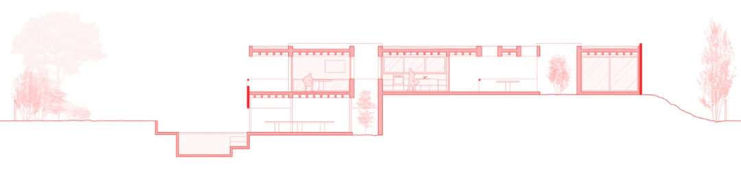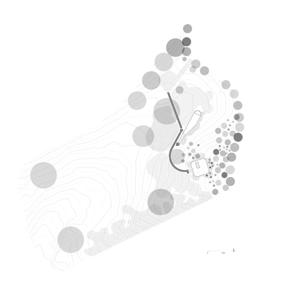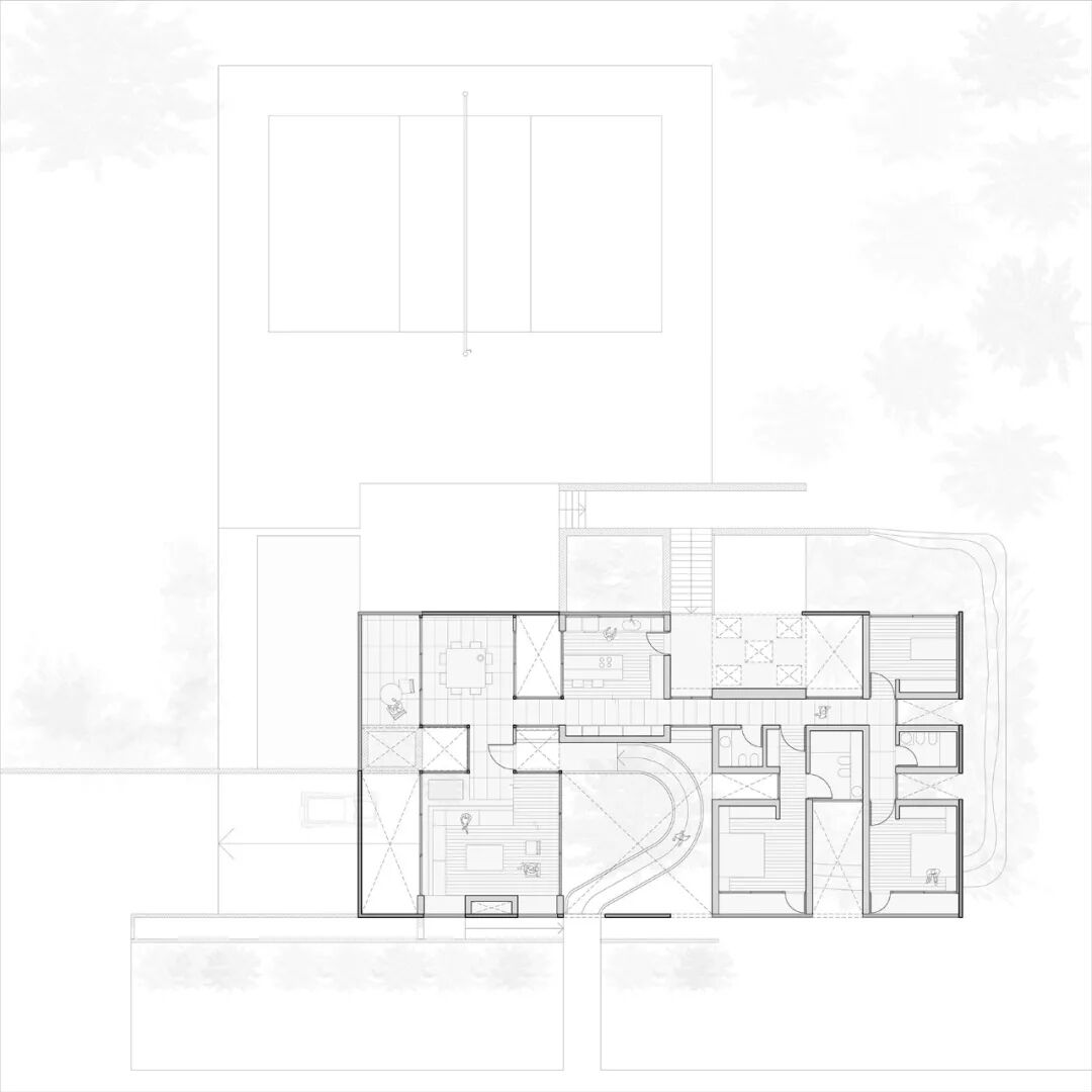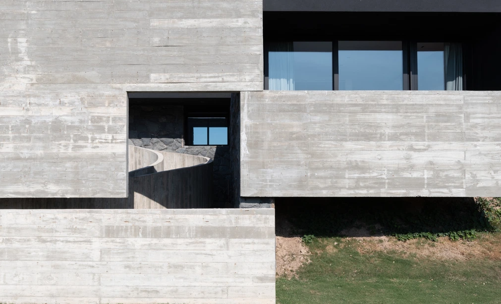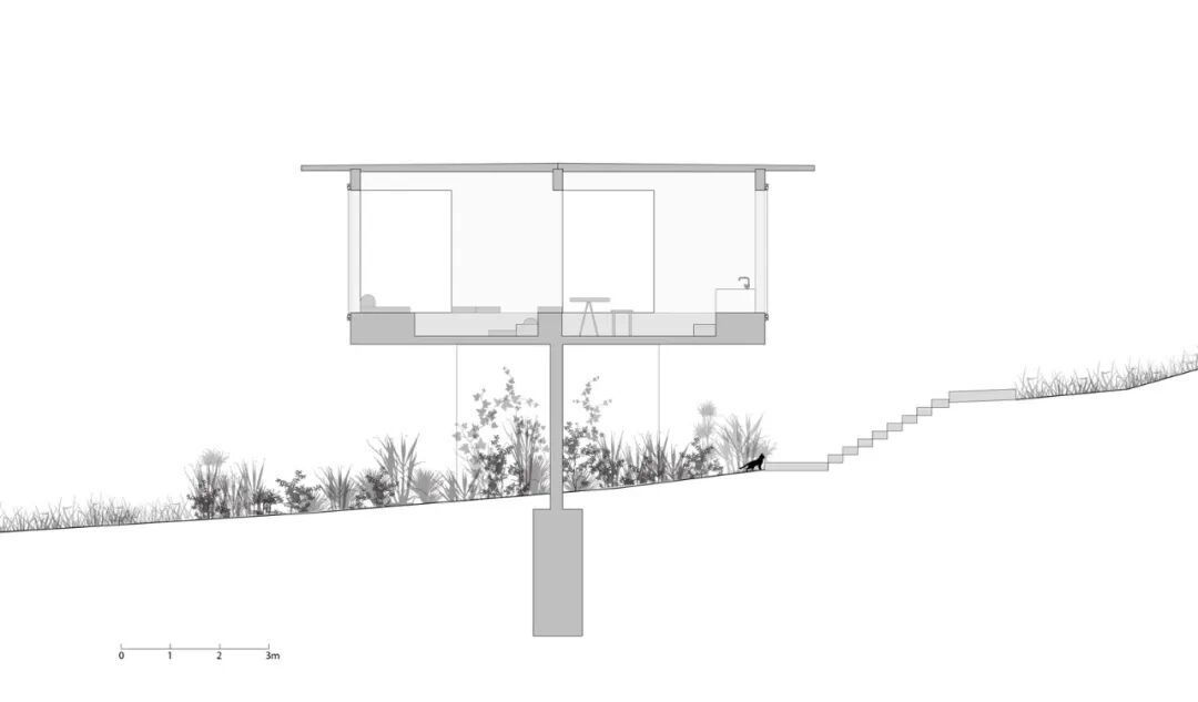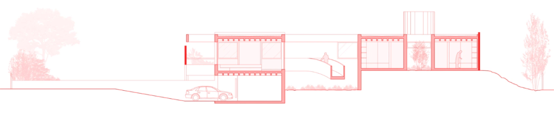 住宅的其中一个体块在平面上接近方形,并通过单根的立柱架空在斜坡之上。另一个体块横向伸展,由一道加厚的挡土墙来保持稳定。