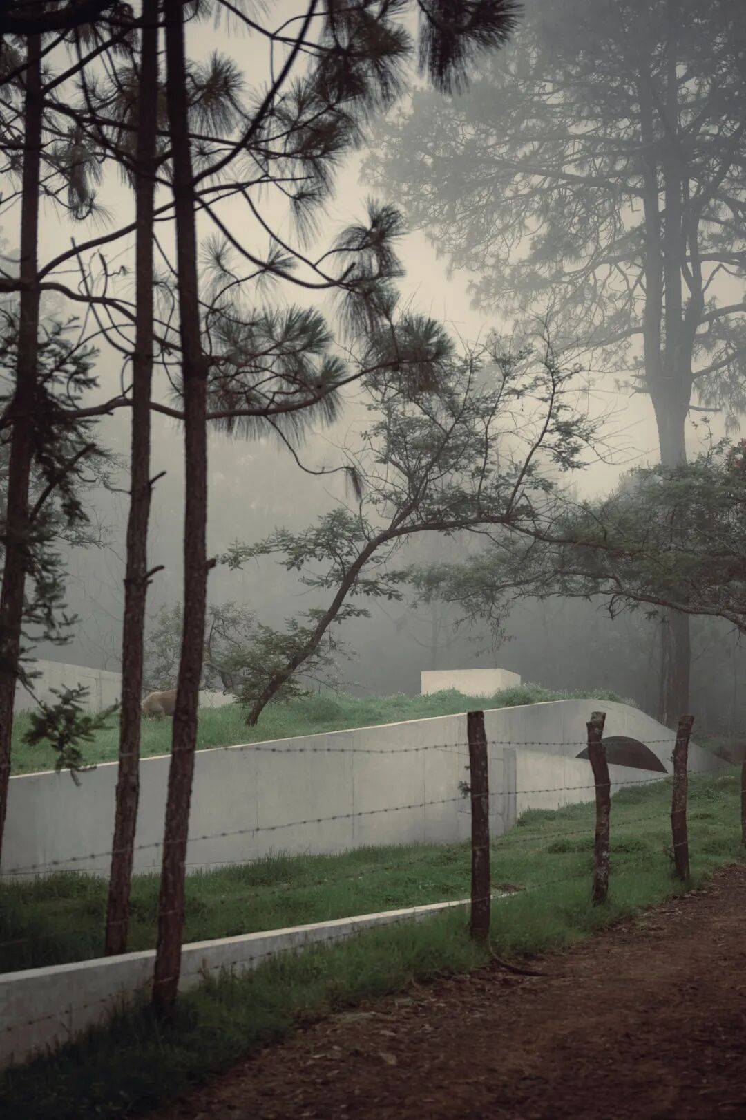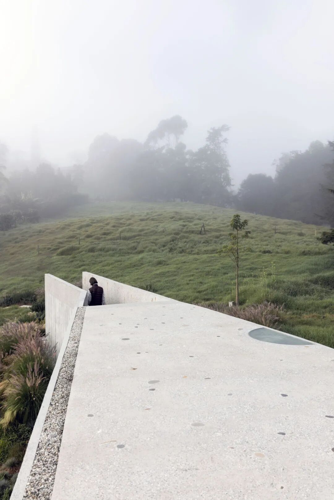 选择混凝土作为主要材料,是源于这样的一个想法:在与森林的相互作用中,新生岩石逐渐风化,颜色由灰色变成绿色、黑色和黄色,最终融入环境。