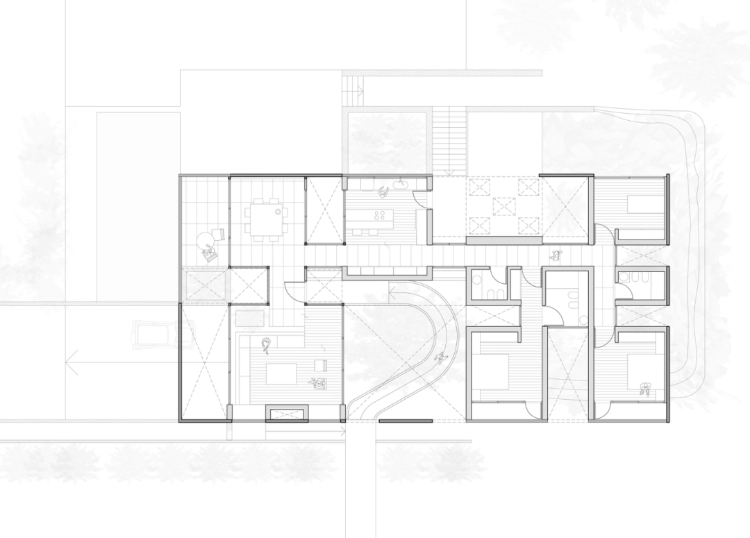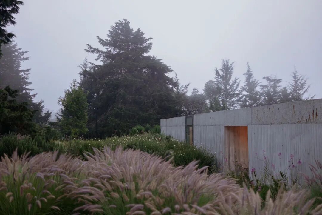 为了进入房子,人们必须穿过一个很长的通道,在途中会经过一棵老松树,它的存在扭曲了侧墙的线性,体现了项目对自然景观的尊重。