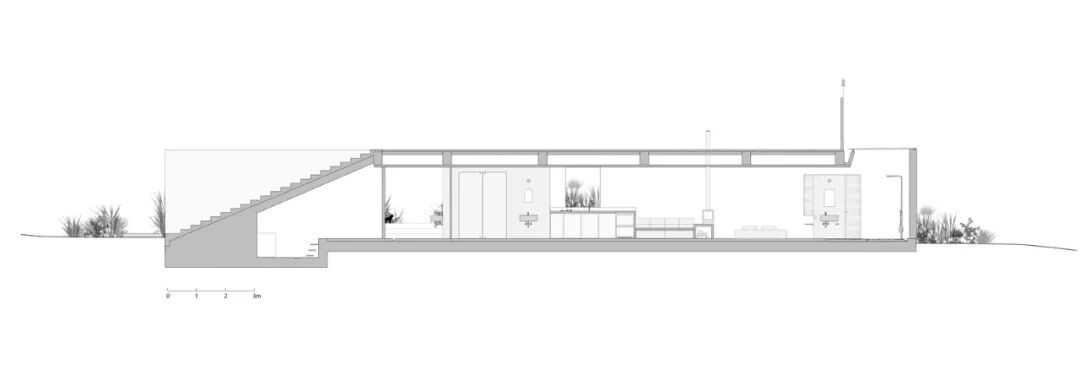 住宅两侧有两条宽阔的混凝土坡道,坡道位于屋顶的下方,屋顶上点缀着天窗,还有一个带有额外入口楼梯的庭院。
