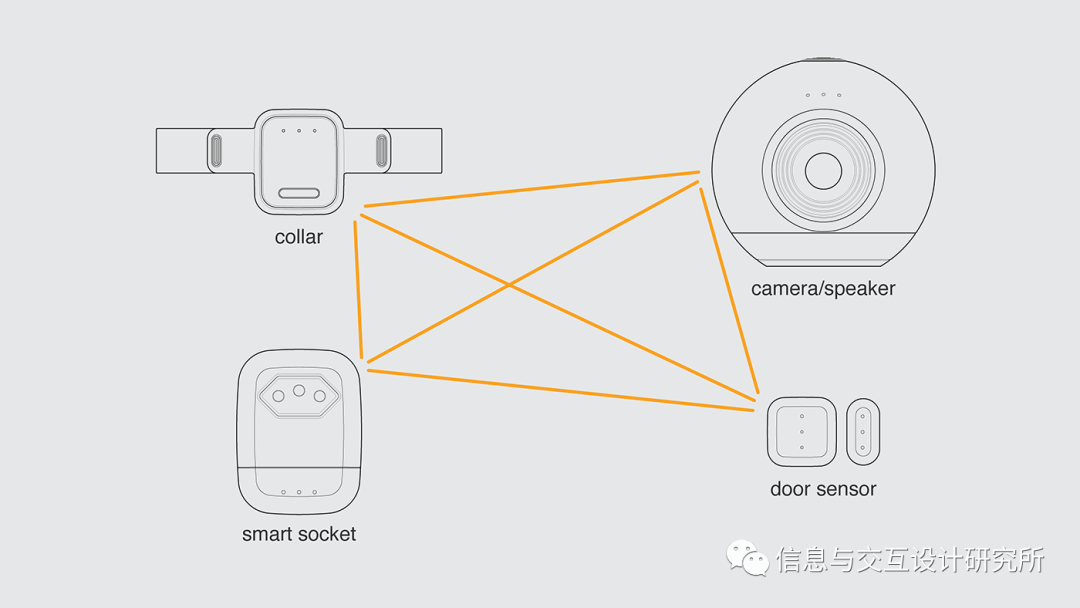 物联网系统由4个产品组成:项圈,摄像头/扬声器,门感应器,智能插座。产品通过蓝牙通信,项圈配有跟踪系统、温度传感器、心率监视器、音频输出与LED手电筒。摄像头/扬声器有音频输入和运动传感器。智能插座有音频输出,接受其他产品的信号与关闭连接到它的设备。门磁在移动过程中与其他设备进行通信。