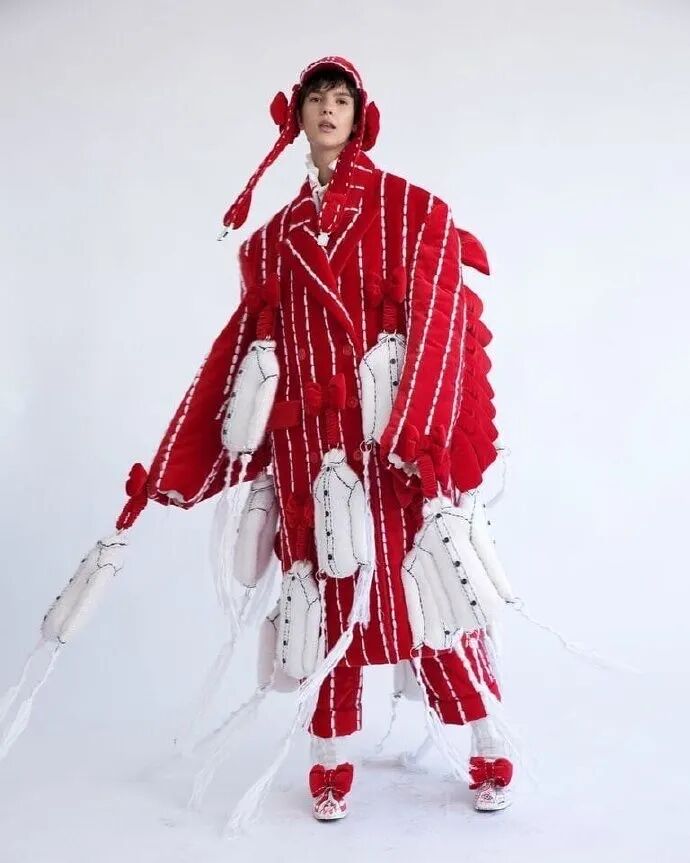 设计师Aharon Genish以童年时期的情感创伤为灵感,以一个孩子的视角经历情感的震撼、复仇到接受的心路历程,巨大廓形下包裹的是孩子脆弱的心灵与各种面具下的彷徨。