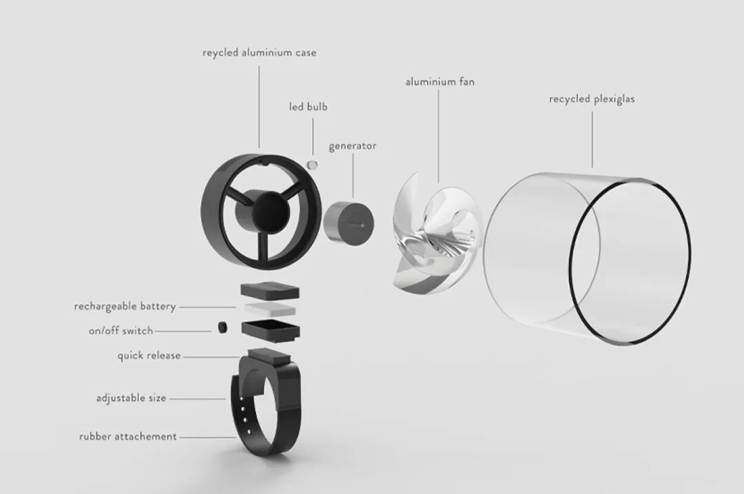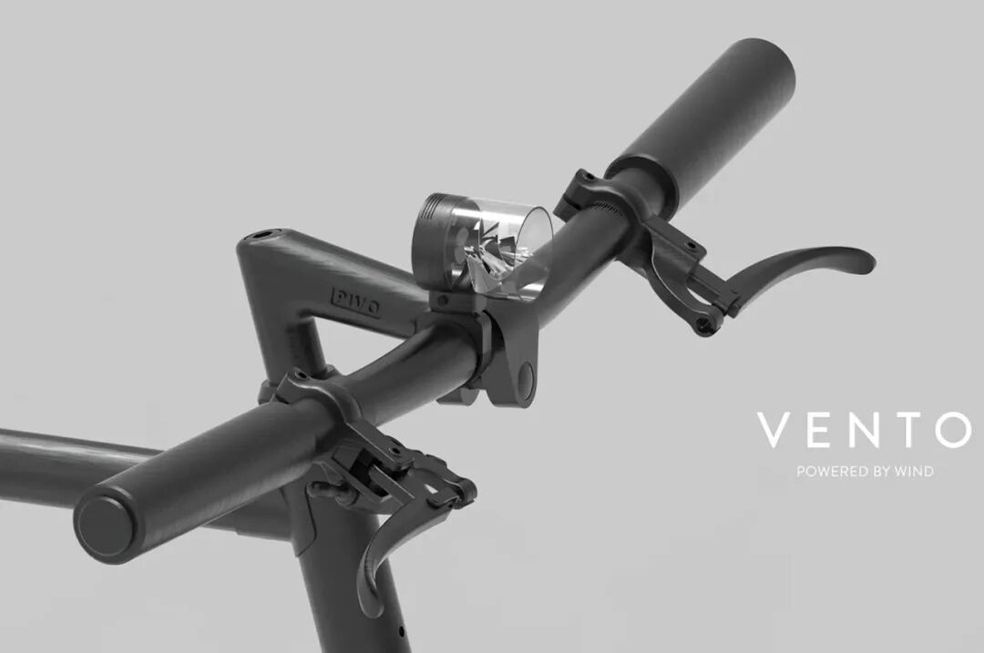 Vento由四个主要部件组成,就像一个微型风力涡轮机。Vento的微型涡轮机由回收的有机玻璃和铝制成,在自行车行驶时能收集风能。随后,能量通过涡轮机发电机中发生的电磁感应转化为电能;最后,由自行车灯的电池存储这些能量,LED灯泡就会产生光啦。