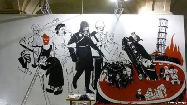 在Mystetskiyi兵工厂举办的“基辅罗斯:伟大和宏伟”纪念展上,R.E.P成员弗拉基米尔·库兹涅佐夫创作了一幅名为《审判日》的大型壁画。这幅颇具挑衅意味的作品描绘了教会的等级制度在地狱的大锅中沸腾,顺便说一下,这完全符合东正教的肖像精神。可是兵工厂机构的负责人宣布不接受这幅作品,并下令将其涂成黑色。这引发了一波反对的抗议浪潮,艺术家们联合抵制并要求官方承认审查和破坏行为,几个月后,蔓延成为全国性的动荡。就像后来发生的事一样,所有一切都是基于对现政权的极大不满,社交媒体是传播和讨论信息的主要平台。