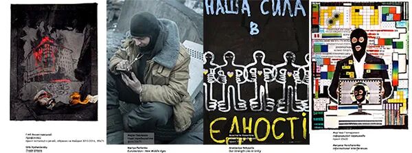 艺术家Semesyuk朗读“自由或死亡”“自由或去你的”以及其他带有大量不可印刷词汇的无政府主义口号,这些口号与Semesyuk和Mann经常在社交网络上发布的令人难忘的文本生动地结合在一起。独立广场成了艺术家们的黄金时刻,他们在靠近独立广场的赫雷什恰蒂克街垒上,组织了一个临时画廊,被称为Mystetskyi艺术堡垒,展出Ivan Semesyuk、Olexa Mann、Andriy Yermolenko、Vitaly Kravets、Lena Dubrova等艺术家的作品,那里也是演讲的场地。那里的艺术家们戴着右翼的讽刺面具,于是当他们在独立广场上喊着极端民族主义的口号时,比持左翼激进观点的艺术家更有信心和更有组织。19