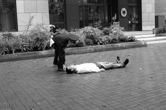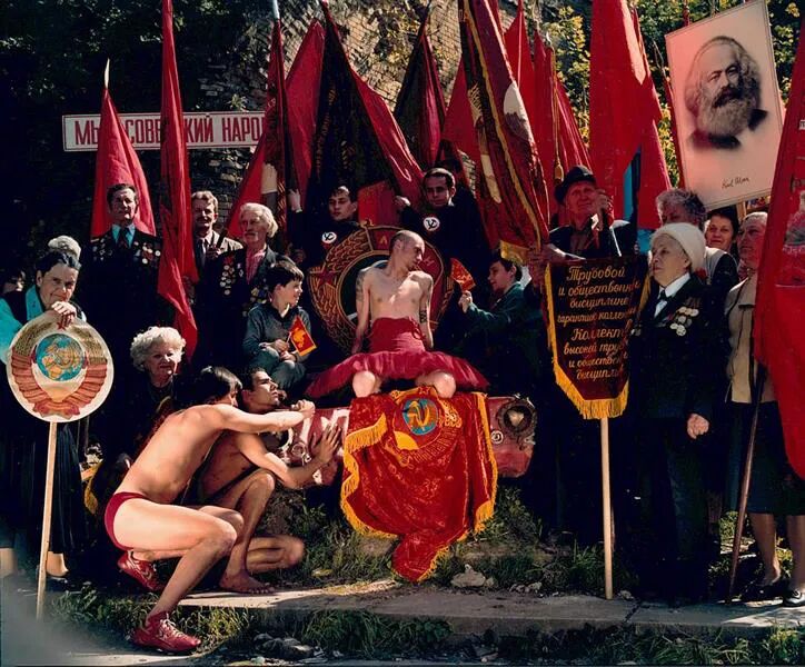 展示的照片充满了紧张和悬念,表演者们用行动来解构一个强大的神话。在广场上,他们开始了奇怪的运动。路人看起来很困惑,但表演背景的人似乎完全无动于衷,没有注意到艺术的挑衅。演员是一种奇异的美,意味着从一个逝去时代的死亡统治中拯救世界。苏联和后苏联之间的冲突在这里被呈现为一种审美矛盾,即不关心政治的青年之间的矛盾,散发着色情能量的美丽演员和冷漠的无脸临时演员。8
