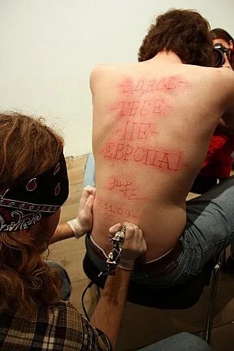 2000年代末,艺术家兼网络博主亚历山大·沃罗达斯基(Alexander Wolodarskij Shiitman)在基辅的乌克兰议会前进行了一次行动,引发轰动。2009年11月2日,为了抗议国家保护公共道德专家委员会的决议,亚历山大和他创立的激进艺术家团体的一名成员在议会大楼前模拟了一场性行为。随后这位艺术家被控流氓罪,在流放地关了五个月。2010年9月29日,沃罗达斯基在审讯中做了一个的纹身行为,把“你不在欧洲”这句话纹在背上,他认为这是乌克兰法律和秩序原则的最好例证。13