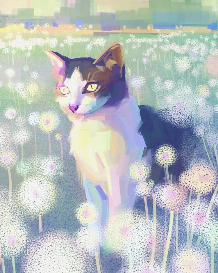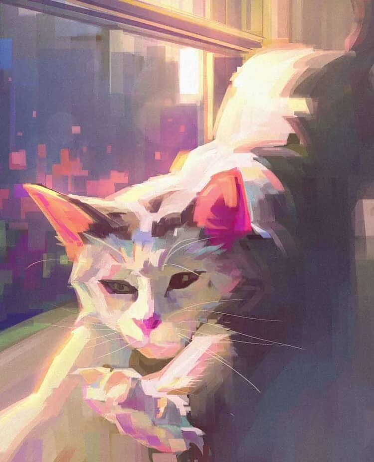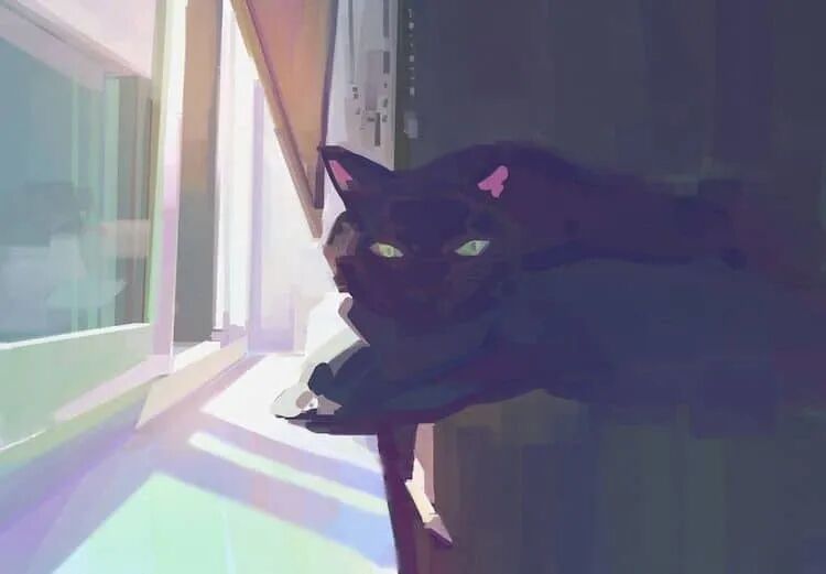 除了氛围的营造,韦恩·蔡对主角猫的描绘,也是强调光源的渲染,而不是猫的细节,大胆、富有表现力的笔触,柔和的色彩,这使得她的数字插画看起来颇有印象派绘画的感觉。当然,这样的作品也唤起了人们久违的放松感,很多人看完这位艺术家的作品,都感觉所有的压力全部释放了,只想跟着这只猫,尽情享受这放松的时刻。