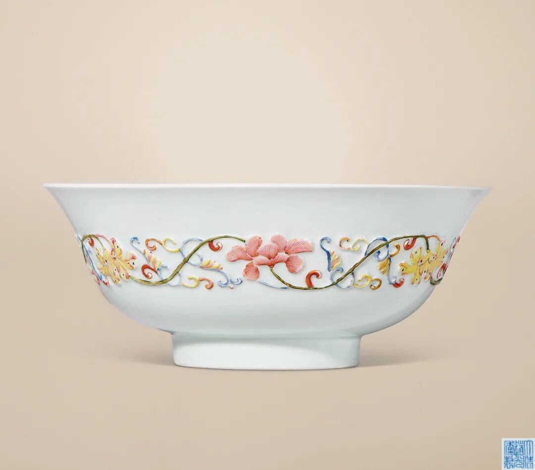 清道光白釉粉彩浮雕缠枝花卉纹碗