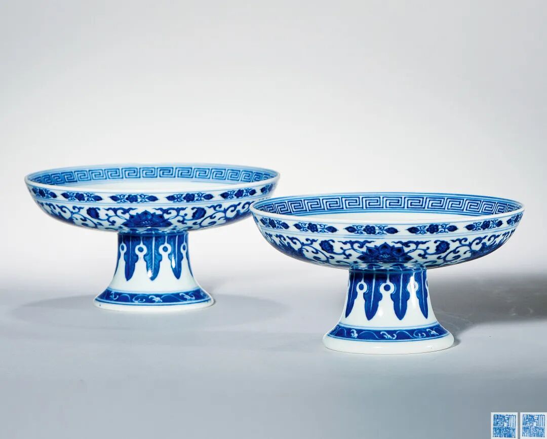 清乾隆青花缠枝西番莲纹高足盘 (一对)