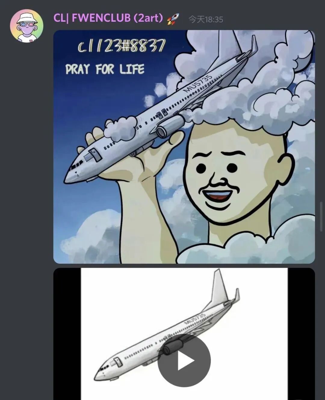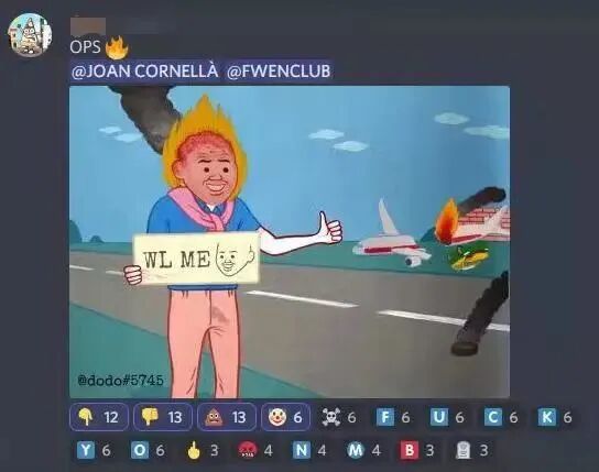 上:FWENCLUB平台的一位Discord社群成员以MU5735空难事件为调侃对象,借用Cornellà的“笑面人”元素进行二次创作