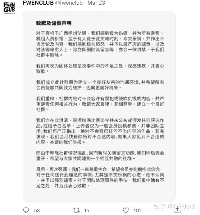 令中国社群更加愤怒的是,FWENCLUB似乎还对这个“带血的作品”进行了一定的推广。面对社群中汹涌而来的抗议与要求下架作品的诉求时,FWENCLUB先是充耳不闻,然后几番用站不住脚的借口为自己的行为和该作品辩解。没有删除和禁止恶性的言论和作品,而是采取措施阻碍网民发声。就这样一直拖到了 3 月 23 日凌晨,平台才终于在其社交媒体官方账号发布道歉公告,声明会员个人立场不代表团队立场,表示会尽快将相关人员从社群剔除。