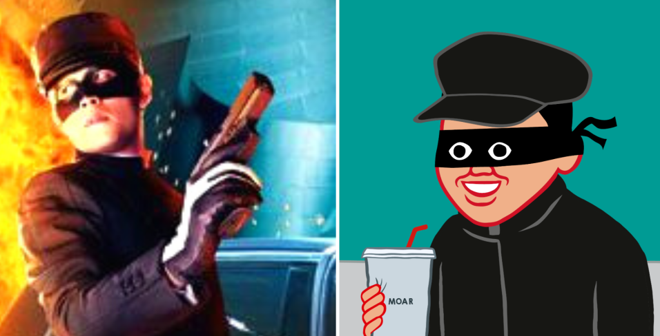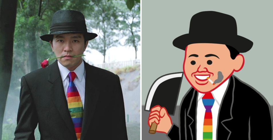 周杰伦在《青蜂侠》中的造型(上左)与周星驰在《国产凌凌漆》中的造型(下左)分别以相似的造型出现在“MOAR by Joan Cornellà”系列中 / 图:电影剧照;“MOAR by Joan Cornellà”已公开作品