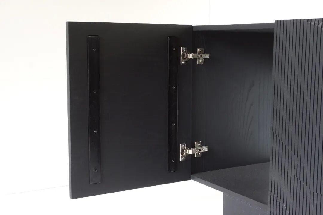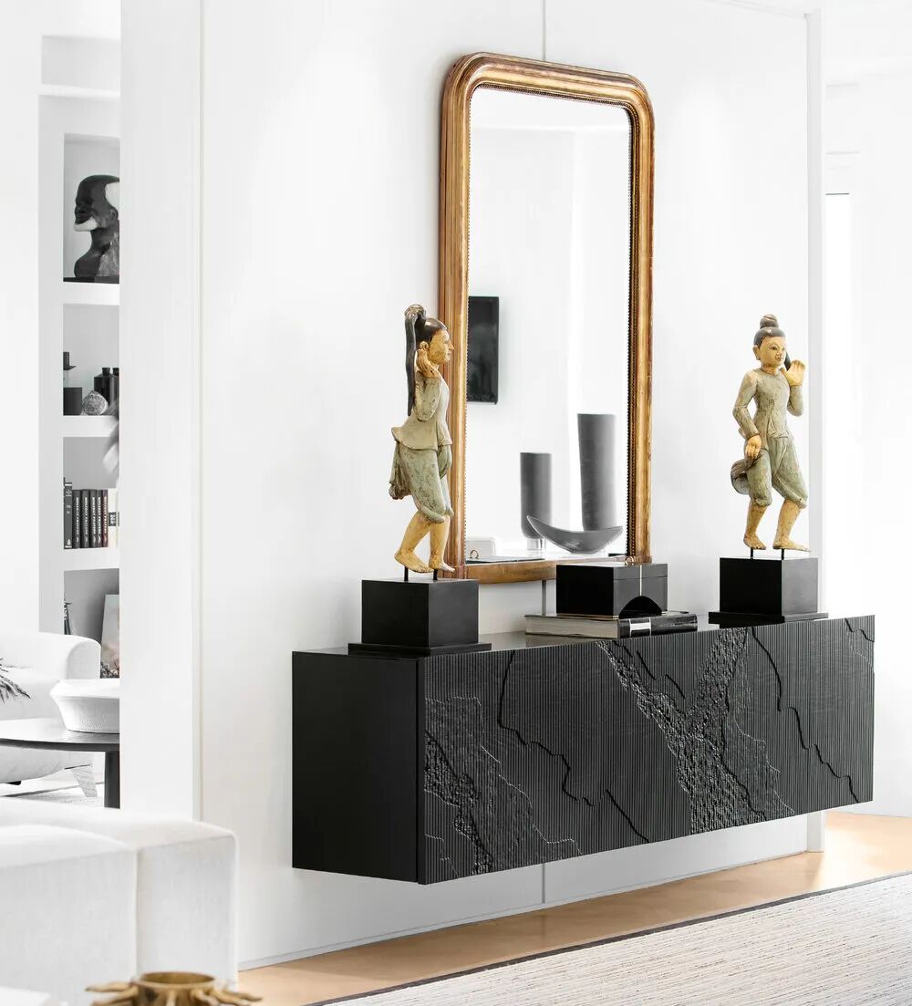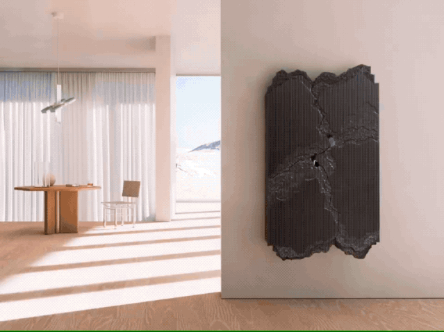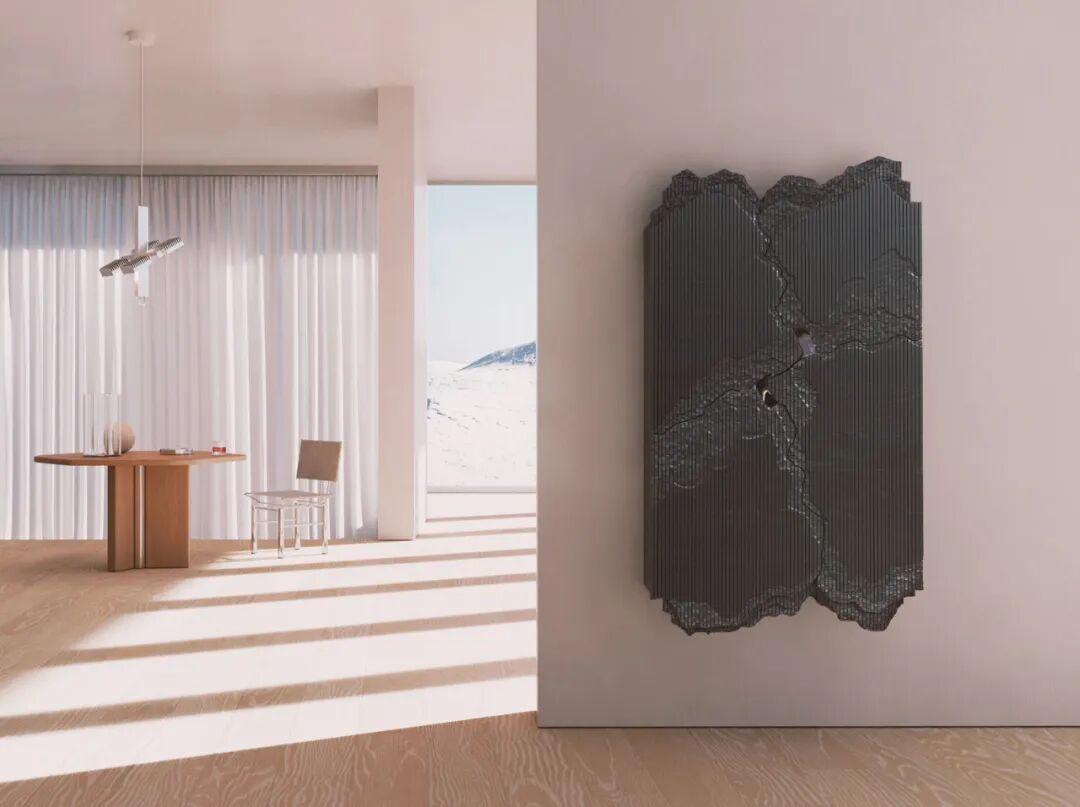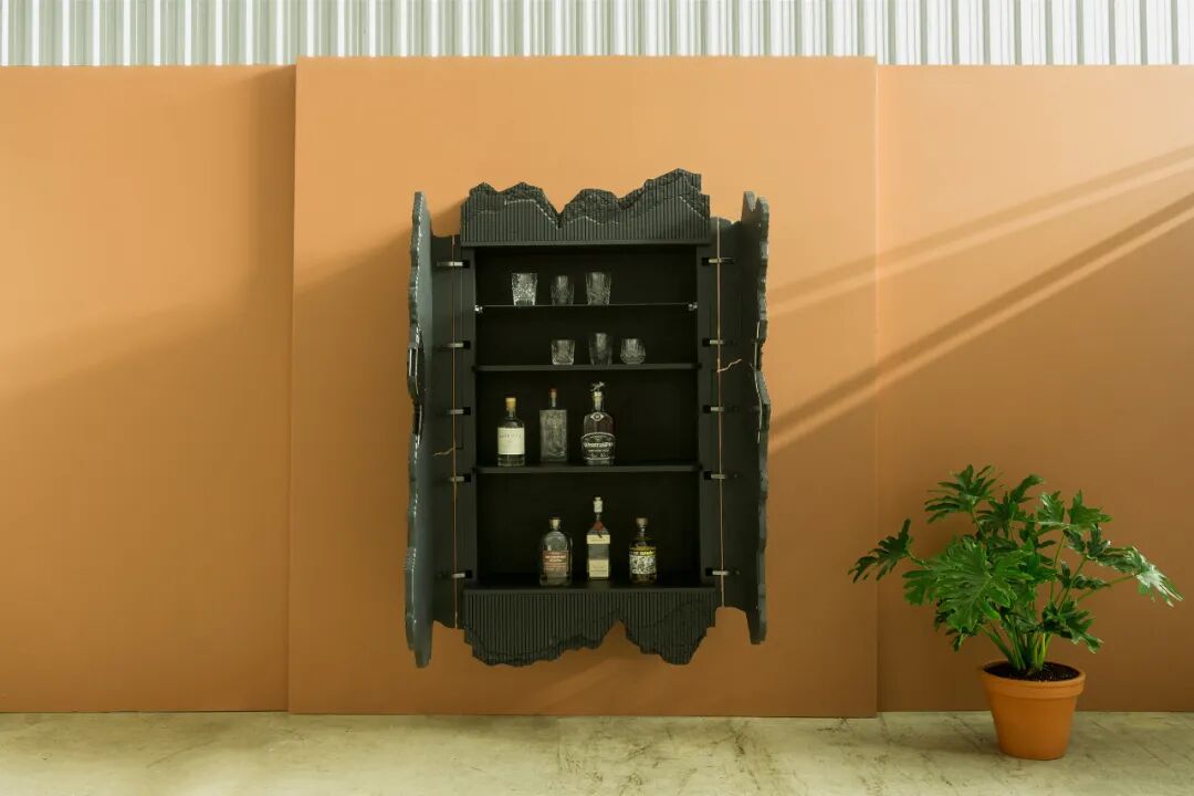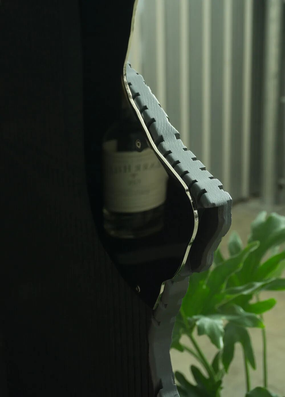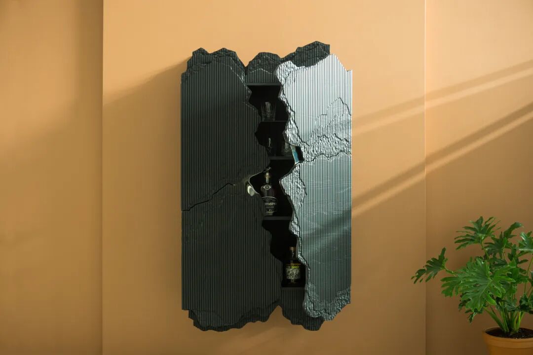 整个柜体的形态是依据岩层的纹理和层次细致刻画出来的,完美展现出岩石坚硬、锋利、破碎的质感。其底部呈现了岩体不规则的轮廓,使壁柜看起来摇摇欲坠,富有十足的雕塑感、韵律感以及趣味性。