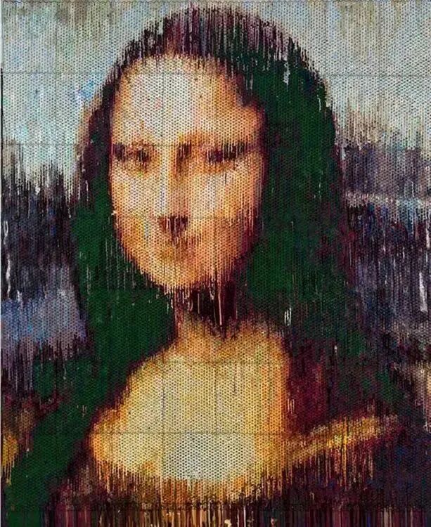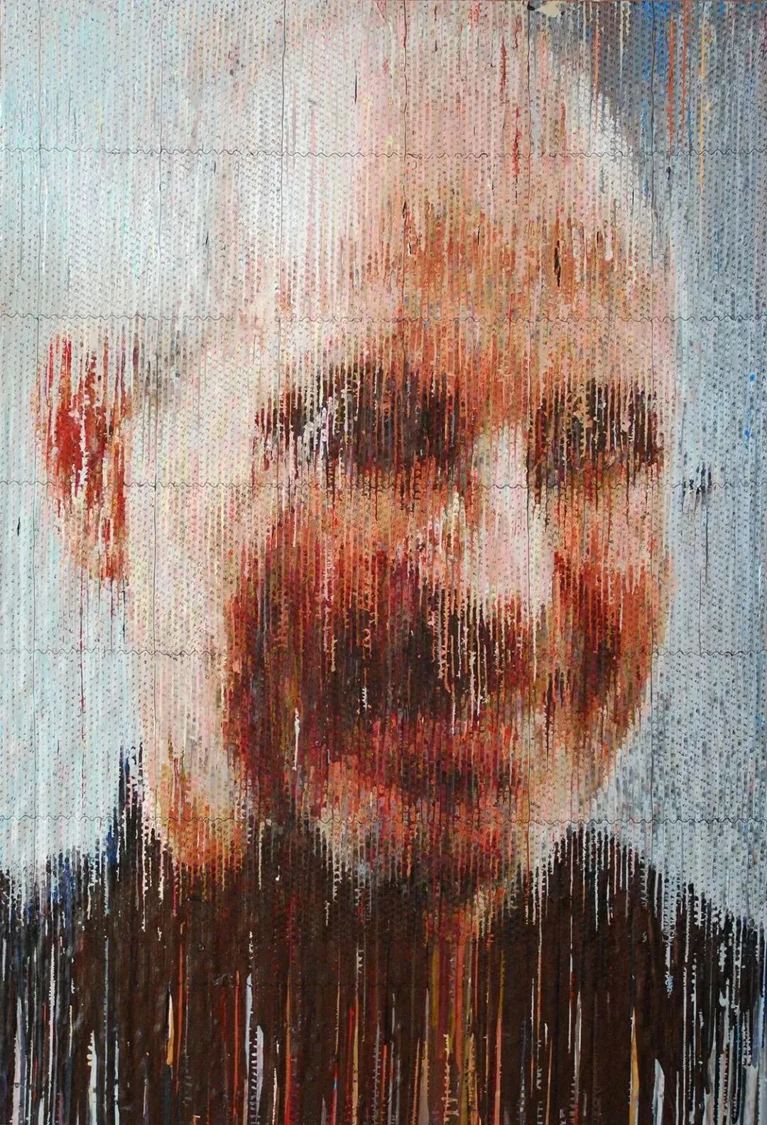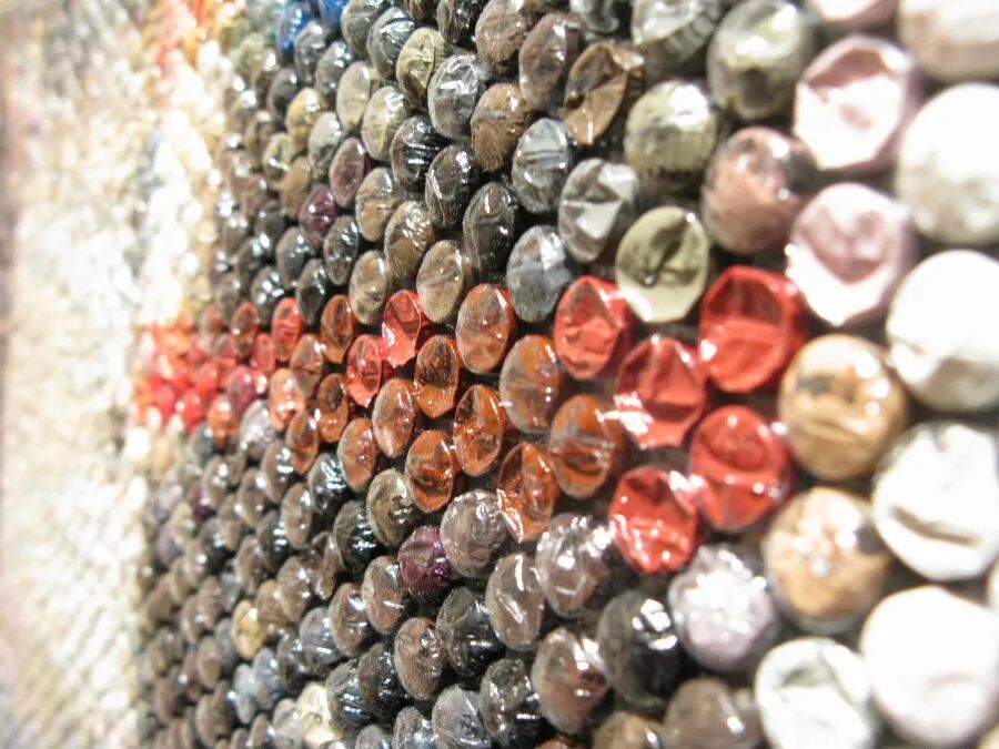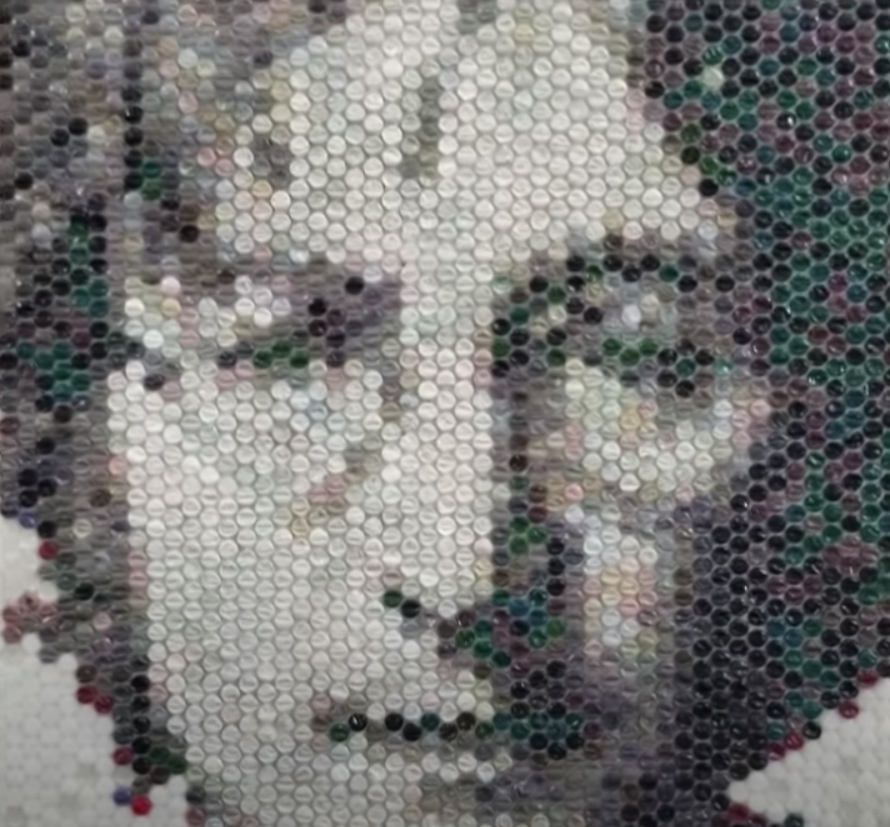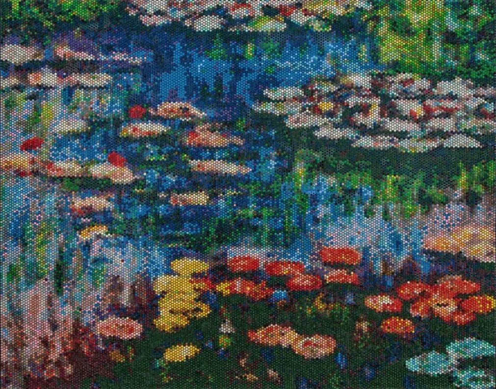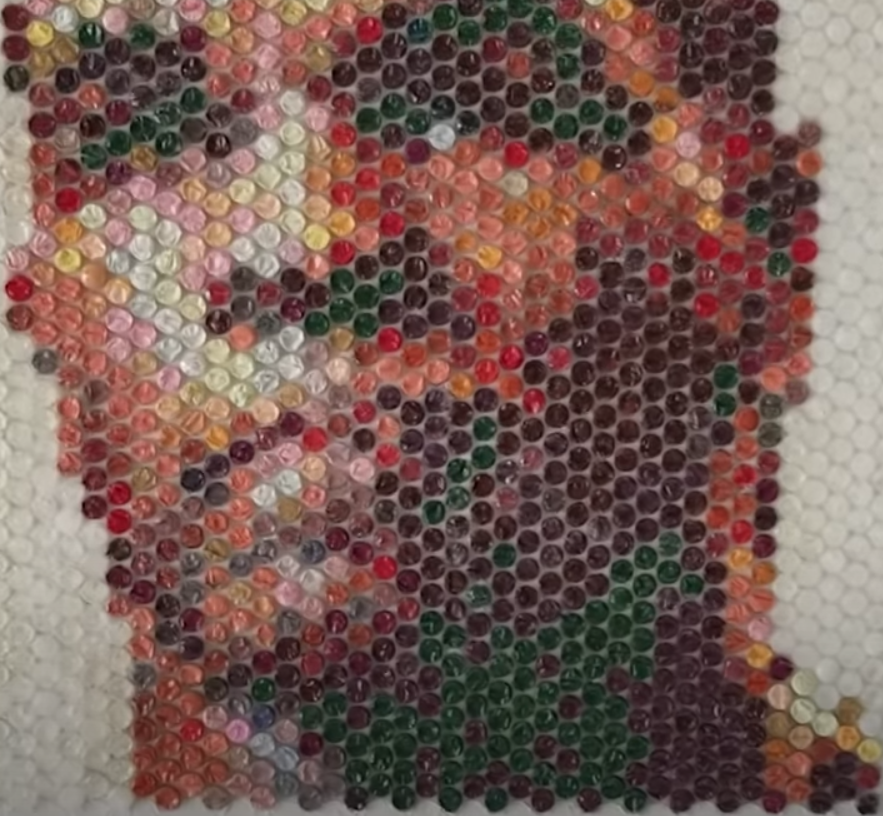BradleyHart在每个气泡膜中注入不同颜料,让每个泡泡都填充了饱满的色彩,构成“像素化”画面。多余的颜料会滴落到作品的背面,再把支撑颜料不外流的泡沫纸撕下,颜料从泡泡里溢出流动,露出作品的印记,组成了另一种抽象的风格。所以他的每幅作品其实都有两个版本,从正面看是“像素派”,但后面确实意想不到的“抽象派”。
