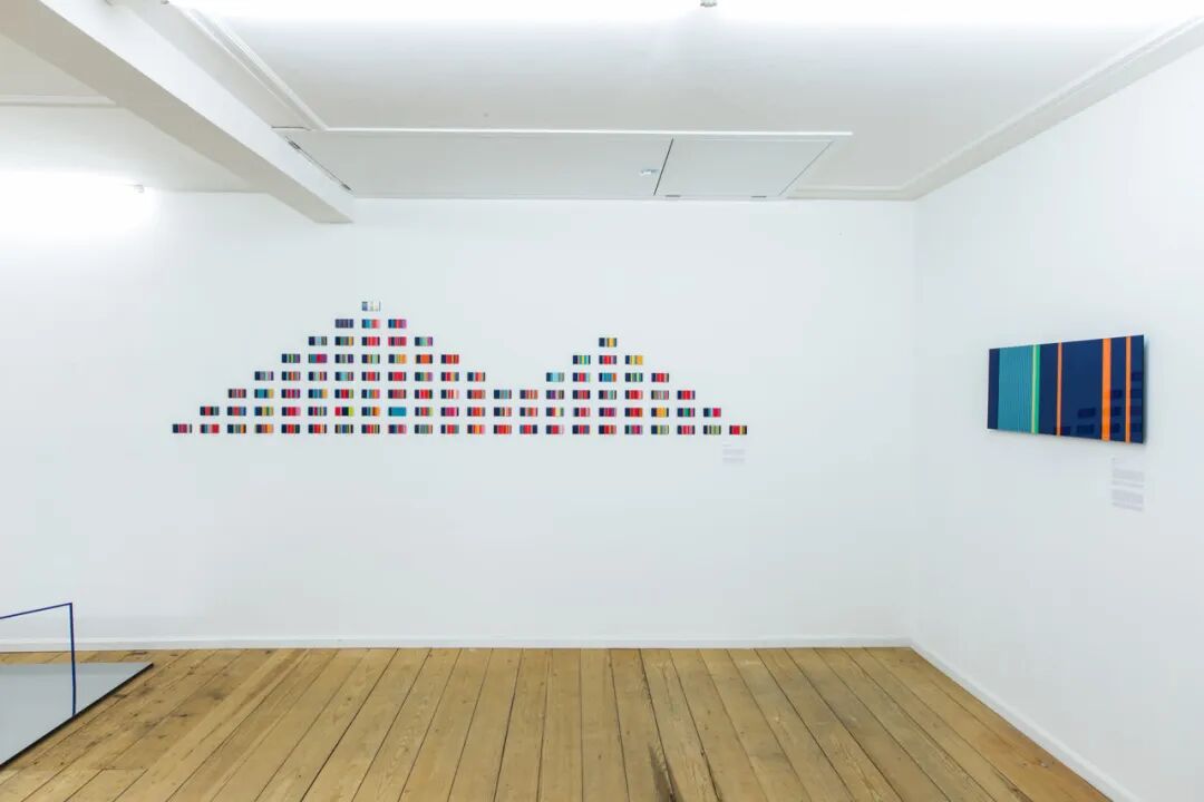 ↑ 注意看:左上第二幅作品为一位受访者卧病在床的奶奶过世前一天的“色带”,深蓝色=睡眠,橘色=进食,这幅作品也是小林和山田印象最为深刻的一件。