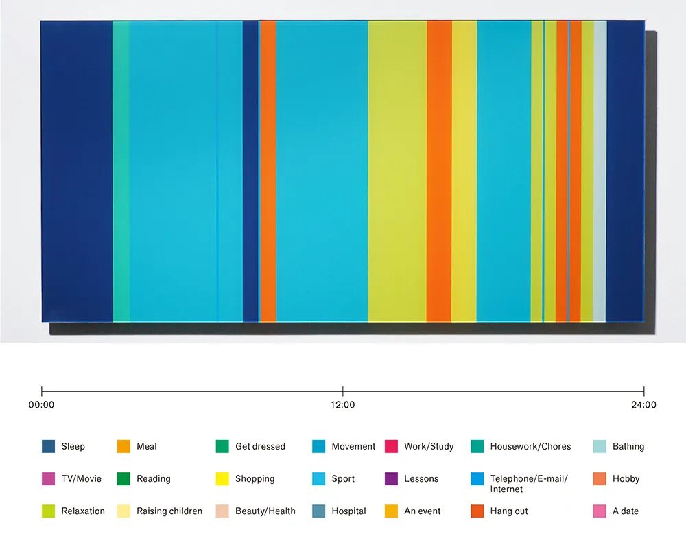 在 SPREAD 的众多作品中,Life Stripe《生命条纹》是他们自工作室成立之初到现在一直持续的作品,这是一个纪实类具备实验性质的艺术项目。他们通过21种不同的色彩(每种色彩代表不同的行为,见下图 ↓),用粗细不一的条纹来展示收集到的不同人(甚至包括动物)在一天内所有行为和动作占据时间分布的真实数据。