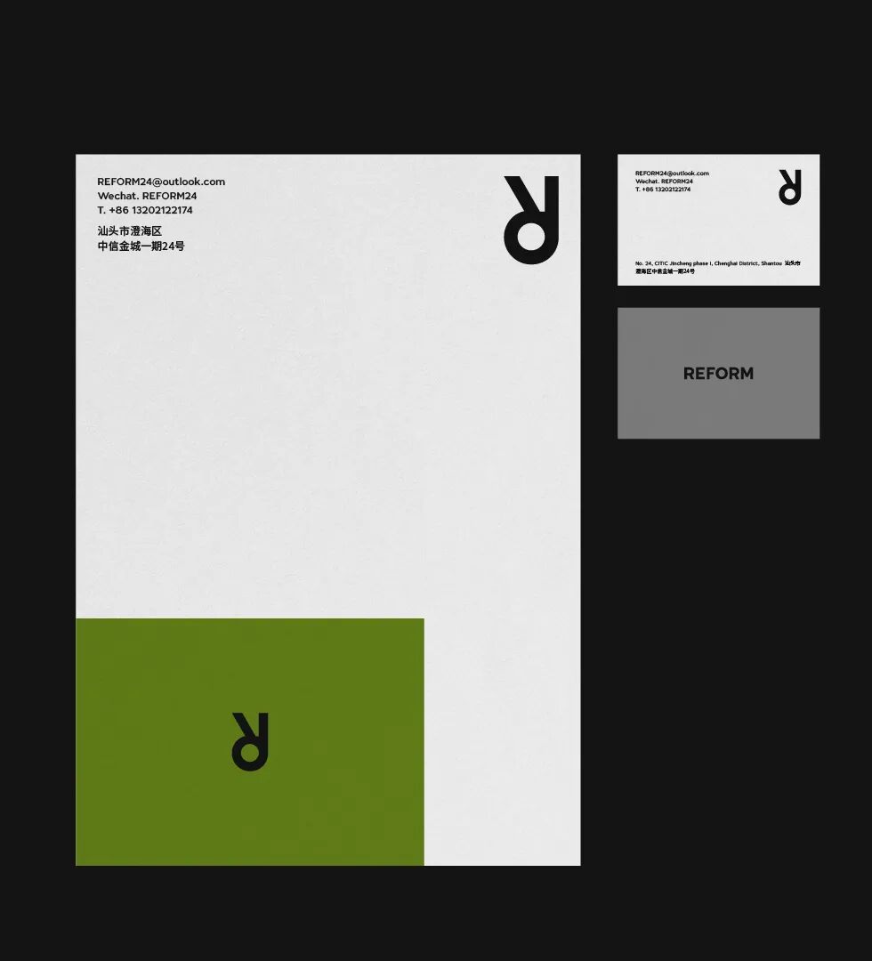 Reform, a fashion buyer's shop in Shantou, Guangdong, also has its own clothing brand of the same name. Reform cofee is a new plate.The letter R, the minimalist element composition, appropriate details and proportions, presents a modern and restrained aesthetic form,The inverted graphic sign "R" gives birth to a gesture like OK, a positive and friendly response that prompts and invites people to try to look at the world from different angles,At the same time, as an OK symbol similar to people's daily use, it has strong extensibility and permeability.